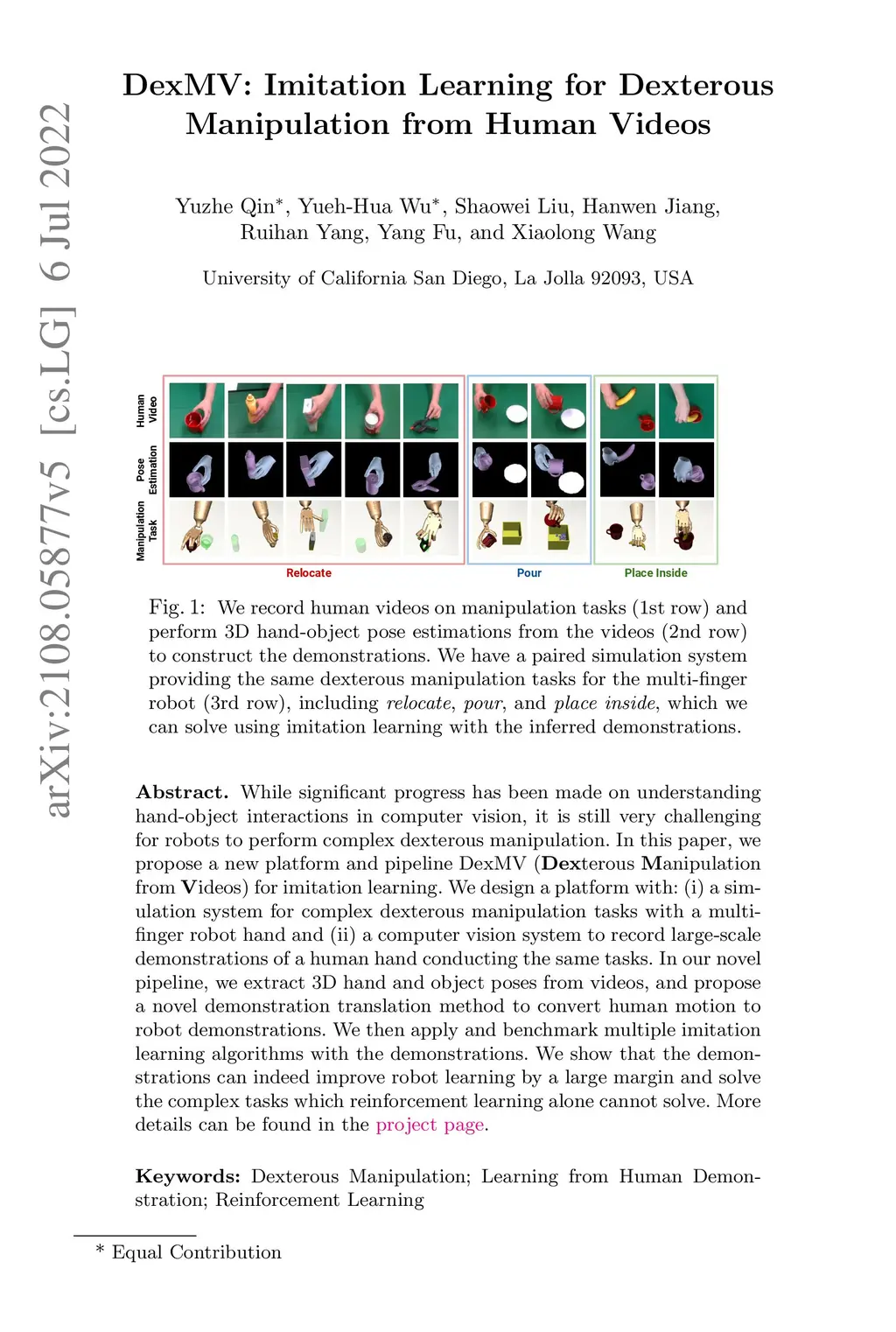 DexMV: Imitation Learning for Dexterous Manipulation from Human Videos