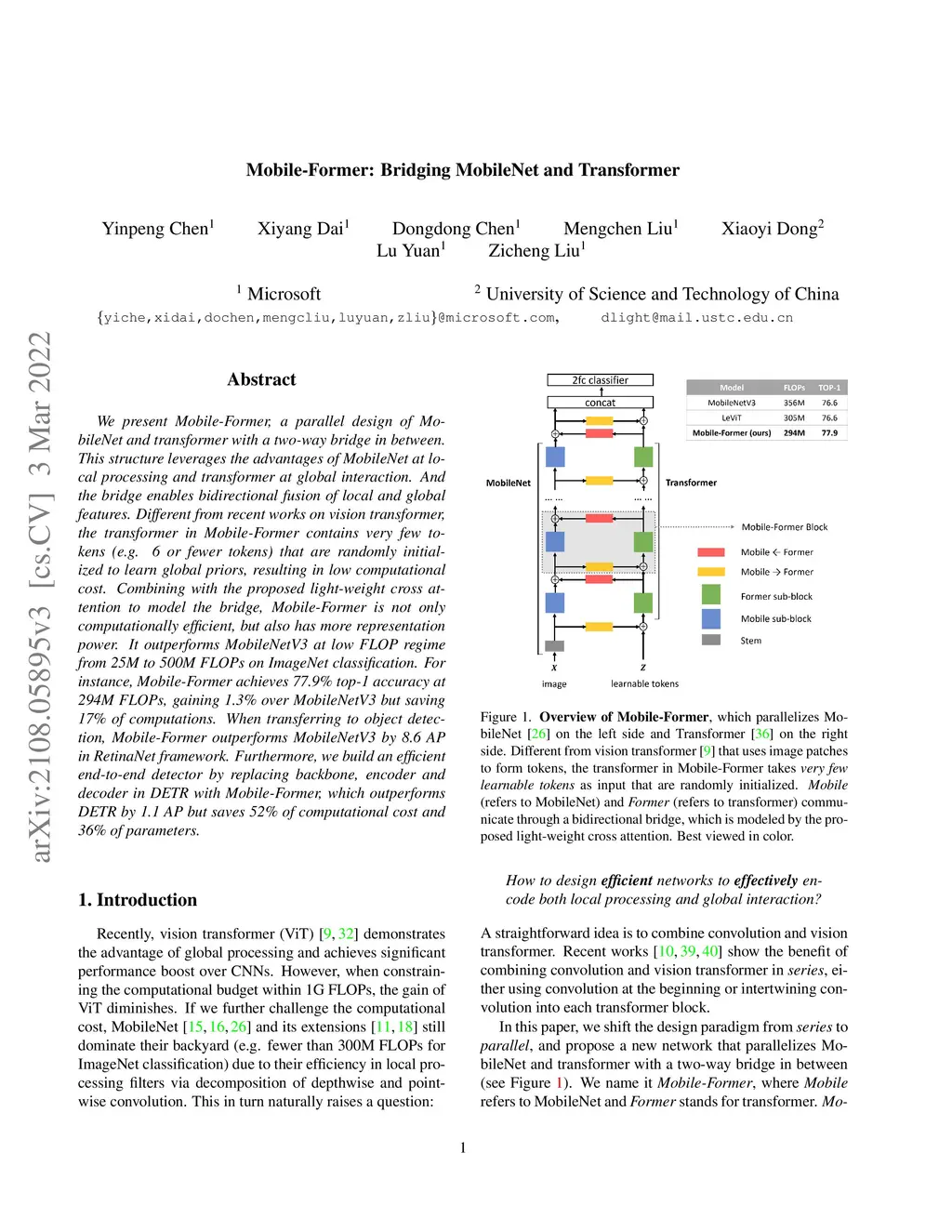 We present Mobile-Former, a parallel design of MobileNet and transformer with a two-way bridge in between. This structure leverages the advantages of MobileNet at local processing and transformer at global interaction. And the bridge enables bidirectional fusion of local and global features. Different from recent works on vision transformer, the transformer in Mobile-Former contains very few tokens (e.g. 6 or fewer tokens) that are randomly initialized to learn global priors, resulting in low computational cost. Combining with the proposed light-weight cross attention to model the bridge, Mobile-Former is not only computationally efficient, but also has more representation power. It outperforms MobileNetV3 at low FLOP regime from 25M to 500M FLOPs on ImageNet classification. For instance, Mobile-Former achieves 77.9\% top-1 accuracy at 294M FLOPs, gaining 1.3\% over MobileNetV3 but saving 17\% of computations. When transferring to object detection, Mobile-Former outperforms MobileNetV3 by 8.6 AP in RetinaNet framework. Furthermore, we build an efficient end-to-end detector by replacing backbone, encoder and decoder in DETR with Mobile-Former, which outperforms DETR by 1.1 AP but saves 52\% of computational cost and 36\% of parameters.