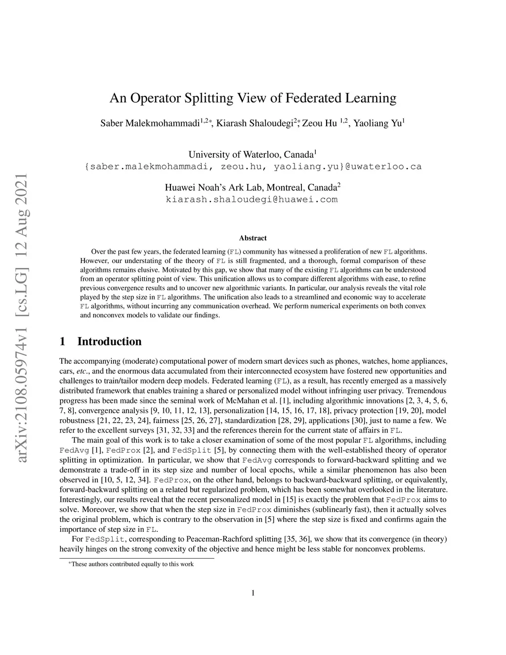 Over the past few years, the federated learning () community has witnessed a proliferation of new algorithms. However, our understating of the theory of is still fragmented, and a thorough, formal comparison of these algorithms remains elusive. Motivated by this gap, we show that many of the existing algorithms can be understood from an operator splitting point of view. This unification allows us to compare different algorithms with ease, to refine previous convergence results and to uncover new algorithmic variants. In particular, our analysis reveals the vital role played by the step size in algorithms. The unification also leads to a streamlined and economic way to accelerate algorithms, without incurring any communication overhead. We perform numerical experiments on both convex and nonconvex models to validate our findings.
