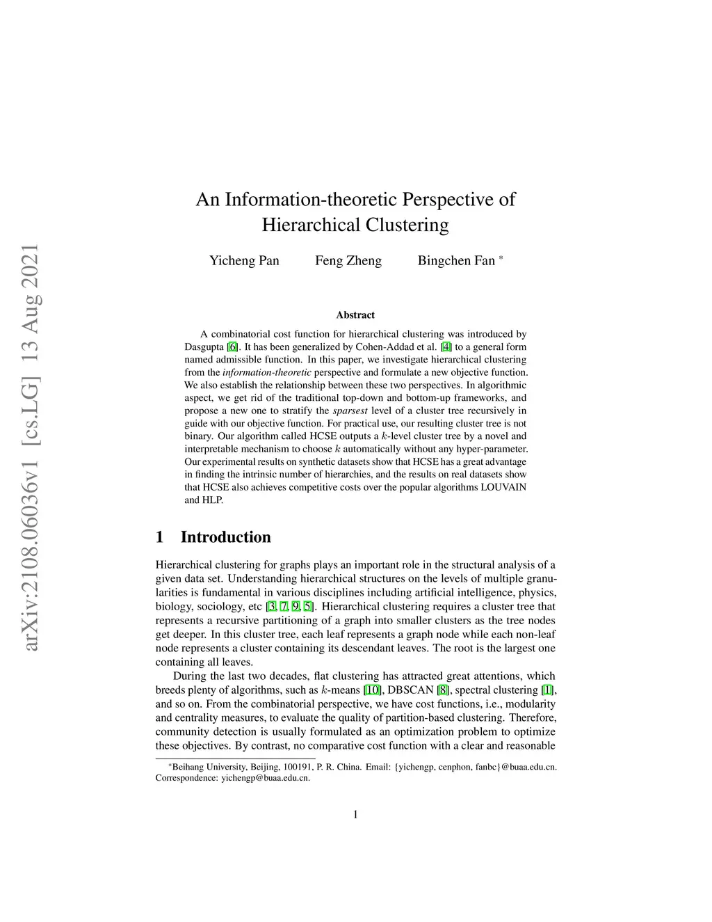 A combinatorial cost function for hierarchical clustering was introduced by Dasgupta \cite{dasgupta2016cost}. It has been generalized by Cohen-Addad et al. \cite{cohen2019hierarchical} to a general form named admissible function. In this paper, we investigate hierarchical clustering from the \emph{information-theoretic} perspective and formulate a new objective function. We also establish the relationship between these two perspectives. In algorithmic aspect, we get rid of the traditional top-down and bottom-up frameworks, and propose a new one to stratify the \emph{sparsest} level of a cluster tree recursively in guide with our objective function. For practical use, our resulting cluster tree is not binary. Our algorithm called HCSE outputs a -level cluster tree by a novel and interpretable mechanism to choose automatically without any hyper-parameter. Our experimental results on synthetic datasets show that HCSE has a great advantage in finding the intrinsic number of hierarchies, and the results on real datasets show that HCSE also achieves competitive costs over the popular algorithms LOUVAIN and HLP.