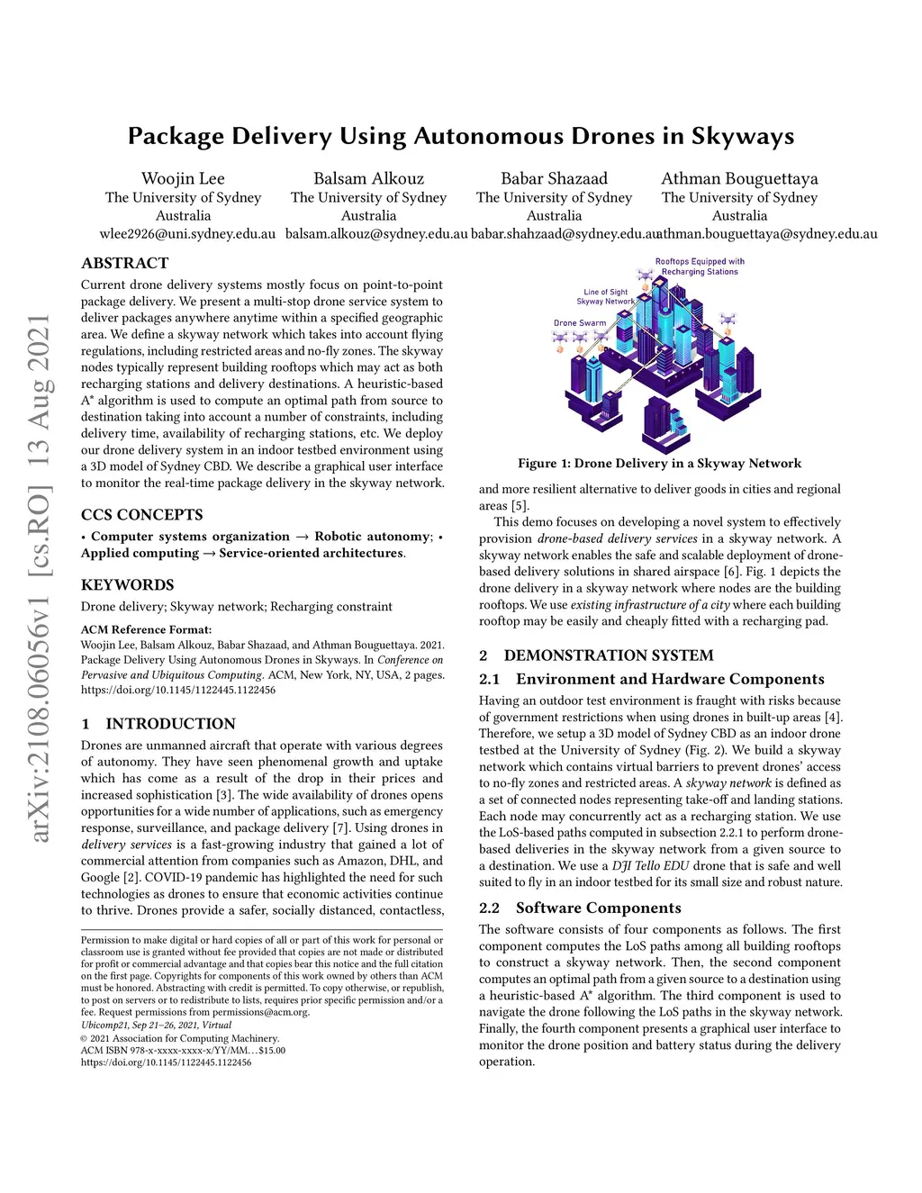 Current drone delivery systems mostly focus on point-to-point package delivery. We present a multi-stop drone service system to deliver packages anywhere anytime within a specified geographic area. We define a skyway network which takes into account flying regulations, including restricted areas and no-fly zones. The skyway nodes typically represent building rooftops which may act as both recharging stations and delivery destinations. A heuristic-based A* algorithm is used to compute an optimal path from source to destination taking into account a number of constraints, including delivery time, availability of recharging stations, etc. We deploy our drone delivery system in an indoor testbed environment using a 3D model of Sydney CBD. We describe a graphical user interface to monitor the real-time package delivery in the skyway network.