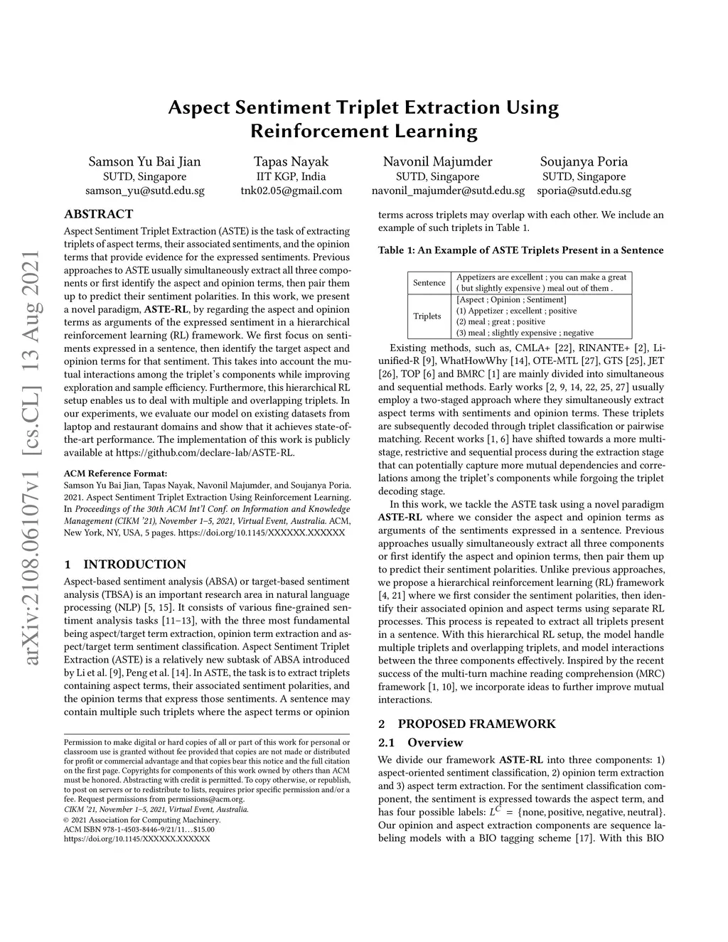 Aspect Sentiment Triplet Extraction Using Reinforcement Learning