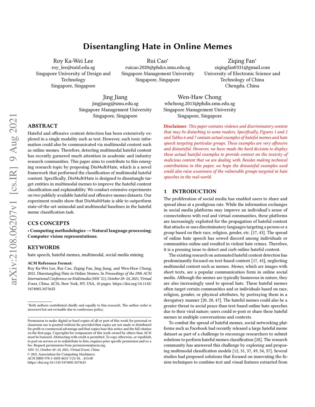 Hateful and offensive content detection has been extensively explored in a single modality such as text. However, such toxic information could also be communicated via multimodal content such as online memes. Therefore, detecting multimodal hateful content has recently garnered much attention in academic and industry research communities. This paper aims to contribute to this emerging research topic by proposing DisMultiHate, which is a novel framework that performed the classification of multimodal hateful content. Specifically, DisMultiHate is designed to disentangle target entities in multimodal memes to improve hateful content classification and explainability. We conduct extensive experiments on two publicly available hateful and offensive memes datasets. Our experiment results show that DisMultiHate is able to outperform state-of-the-art unimodal and multimodal baselines in the hateful meme classification task. Empirical case studies were also conducted to demonstrate DisMultiHate's ability to disentangle target entities in memes and ultimately showcase DisMultiHate's explainability of the multimodal hateful content classification task.