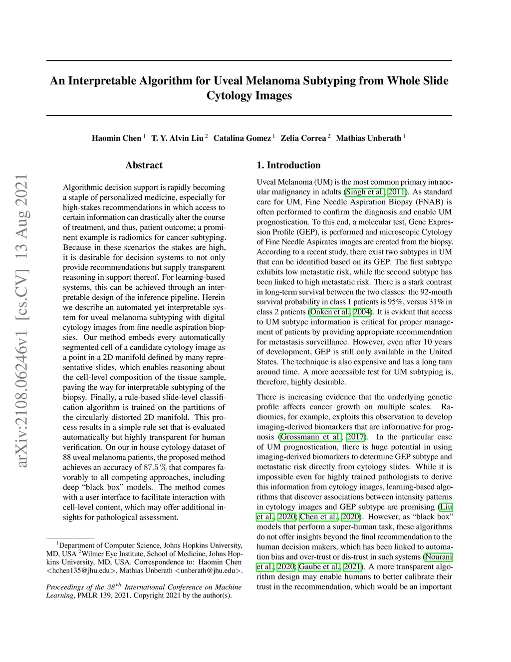 Algorithmic decision support is rapidly becoming a staple of personalized medicine, especially for high-stakes recommendations in which access to certain information can drastically alter the course of treatment, and thus, patient outcome; a prominent example is radiomics for cancer subtyping. Because in these scenarios the stakes are high, it is desirable for decision systems to not only provide recommendations but supply transparent reasoning in support thereof. For learning-based systems, this can be achieved through an interpretable design of the inference pipeline. Herein we describe an automated yet interpretable system for uveal melanoma subtyping with digital cytology images from fine needle aspiration biopsies. Our method embeds every automatically segmented cell of a candidate cytology image as a point in a 2D manifold defined by many representative slides, which enables reasoning about the cell-level composition of the tissue sample, paving the way for interpretable subtyping of the biopsy. Finally, a rule-based slide-level classification algorithm is trained on the partitions of the circularly distorted 2D manifold. This process results in a simple rule set that is evaluated automatically but highly transparent for human verification. On our in house cytology dataset of 88 uveal melanoma patients, the proposed method achieves an accuracy of 87.5% that compares favorably to all competing approaches, including deep "black box" models. The method comes with a user interface to facilitate interaction with cell-level content, which may offer additional insights for pathological assessment.