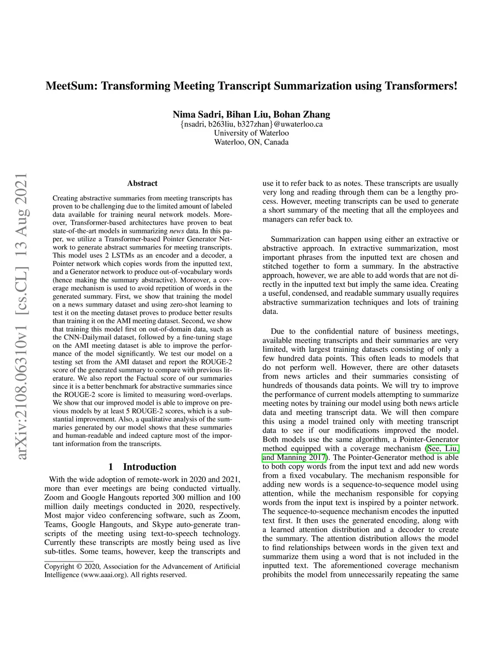 Creating abstractive summaries from meeting transcripts has proven to be challenging due to the limited amount of labeled data available for training neural network models. Moreover, Transformer-based architectures have proven to beat state-of-the-art models in summarizing news data. In this paper, we utilize a Transformer-based Pointer Generator Network to generate abstract summaries for meeting transcripts. This model uses 2 LSTMs as an encoder and a decoder, a Pointer network which copies words from the inputted text, and a Generator network to produce out-of-vocabulary words (hence making the summary abstractive). Moreover, a coverage mechanism is used to avoid repetition of words in the generated summary. First, we show that training the model on a news summary dataset and using zero-shot learning to test it on the meeting dataset proves to produce better results than training it on the AMI meeting dataset. Second, we show that training this model first on out-of-domain data, such as the CNN-Dailymail dataset, followed by a fine-tuning stage on the AMI meeting dataset is able to improve the performance of the model significantly. We test our model on a testing set from the AMI dataset and report the ROUGE-2 score of the generated summary to compare with previous literature. We also report the Factual score of our summaries since it is a better benchmark for abstractive summaries since the ROUGE-2 score is limited to measuring word-overlaps. We show that our improved model is able to improve on previous models by at least 5 ROUGE-2 scores, which is a substantial improvement. Also, a qualitative analysis of the summaries generated by our model shows that these summaries and human-readable and indeed capture most of the important information from the transcripts.