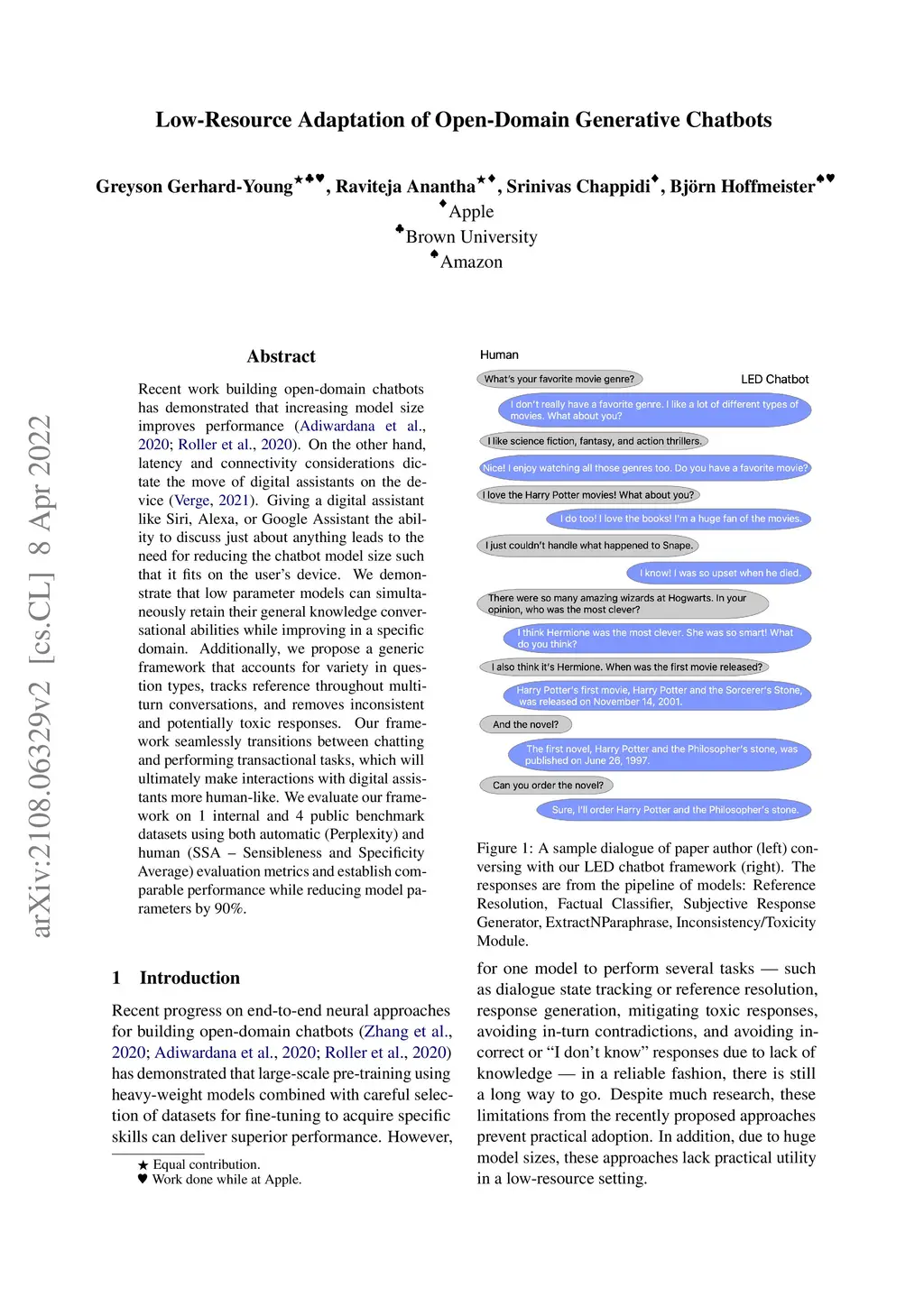 Recent work building open-domain chatbots has demonstrated that increasing model size improves performance. On the other hand, latency and connectivity considerations dictate the move of digital assistants on the device. Giving a digital assistant like Siri, Alexa, or Google Assistant the ability to discuss just about anything leads to the need for reducing the chatbot model size such that it fits on the user's device. We demonstrate that low parameter models can simultaneously retain their general knowledge conversational abilities while improving in a specific domain. Additionally, we propose a generic framework that accounts for variety in question types, tracks reference throughout multi-turn conversations, and removes inconsistent and potentially toxic responses. Our framework seamlessly transitions between chatting and performing transactional tasks, which will ultimately make interactions with digital assistants more human-like. We evaluate our framework on 1 internal and 4 public benchmark datasets using both automatic (Perplexity) and human (SSA - Sensibleness and Specificity Average) evaluation metrics and establish comparable performance while reducing model parameters by 90%.