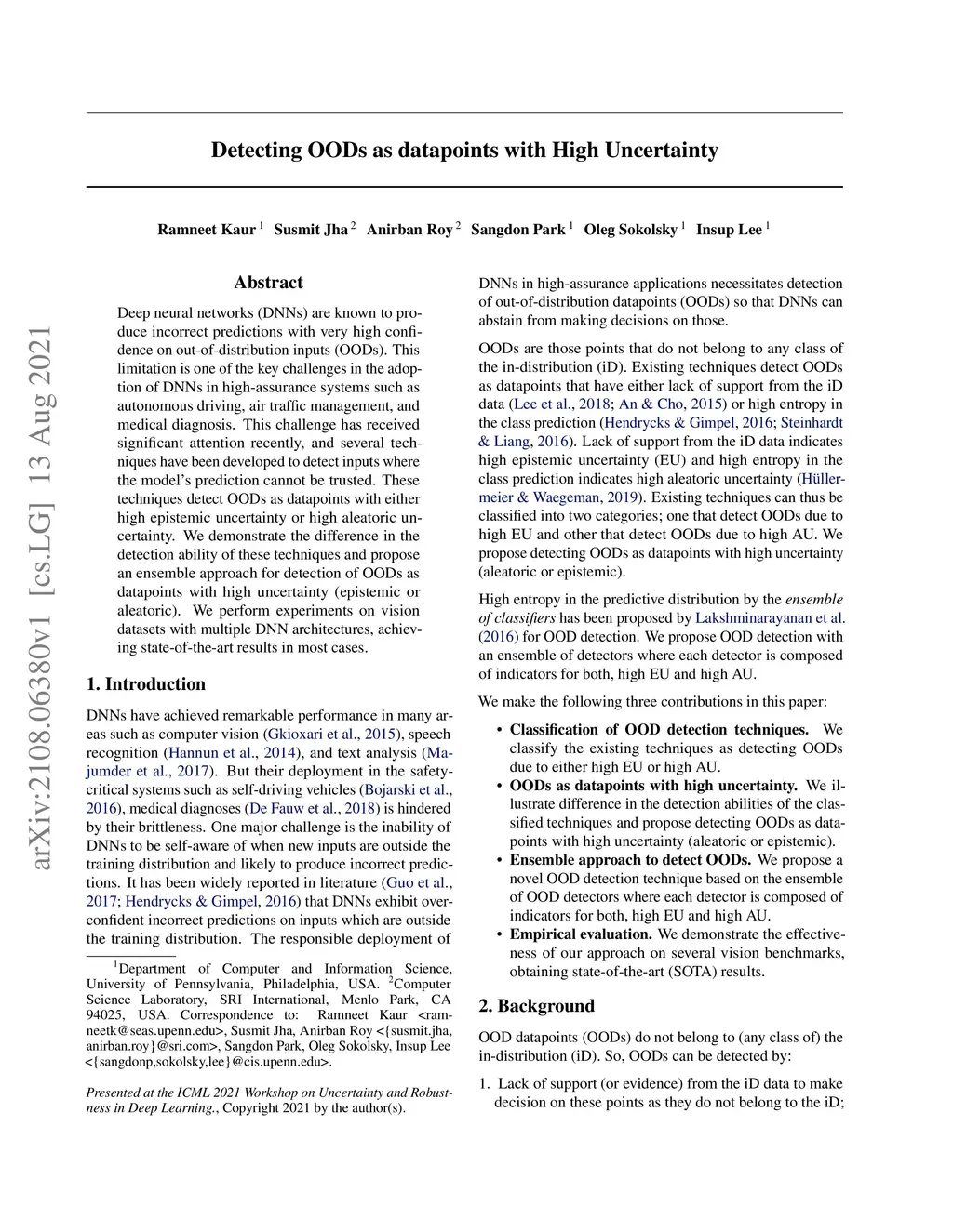 Deep neural networks (DNNs) are known to produce incorrect predictions with very high confidence on out-of-distribution inputs (OODs). This limitation is one of the key challenges in the adoption of DNNs in high-assurance systems such as autonomous driving, air traffic management, and medical diagnosis. This challenge has received significant attention recently, and several techniques have been developed to detect inputs where the model's prediction cannot be trusted. These techniques detect OODs as datapoints with either high epistemic uncertainty or high aleatoric uncertainty. We demonstrate the difference in the detection ability of these techniques and propose an ensemble approach for detection of OODs as datapoints with high uncertainty (epistemic or aleatoric). We perform experiments on vision datasets with multiple DNN architectures, achieving state-of-the-art results in most cases.