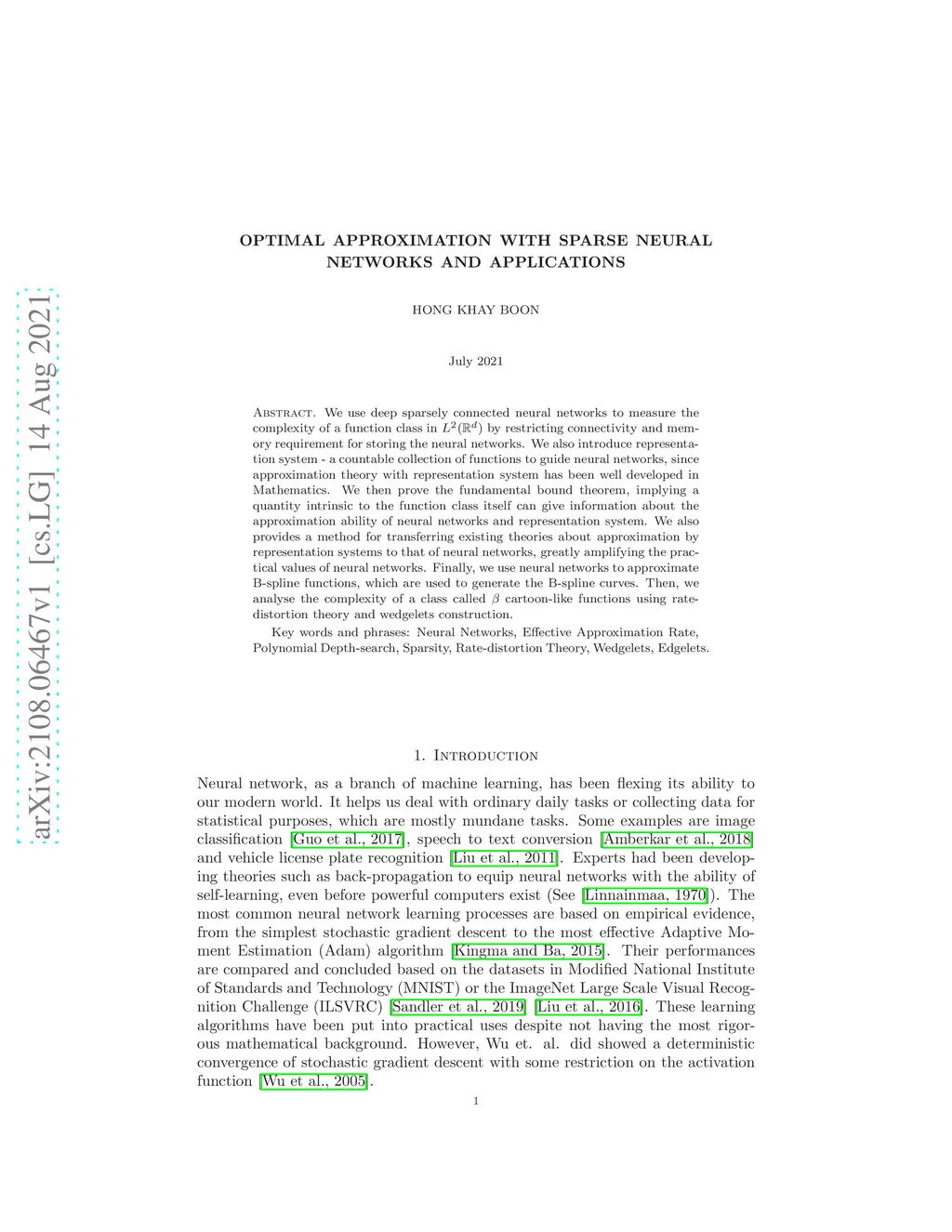 We use deep sparsely connected neural networks to measure the complexity of a function class in by restricting connectivity and memory requirement for storing the neural networks. We also introduce representation system - a countable collection of functions to guide neural networks, since approximation theory with representation system has been well developed in Mathematics. We then prove the fundamental bound theorem, implying a quantity intrinsic to the function class itself can give information about the approximation ability of neural networks and representation system. We also provides a method for transferring existing theories about approximation by representation systems to that of neural networks, greatly amplifying the practical values of neural networks. Finally, we use neural networks to approximate B-spline functions, which are used to generate the B-spline curves. Then, we analyse the complexity of a class called cartoon-like functions using rate-distortion theory and wedgelets construction.