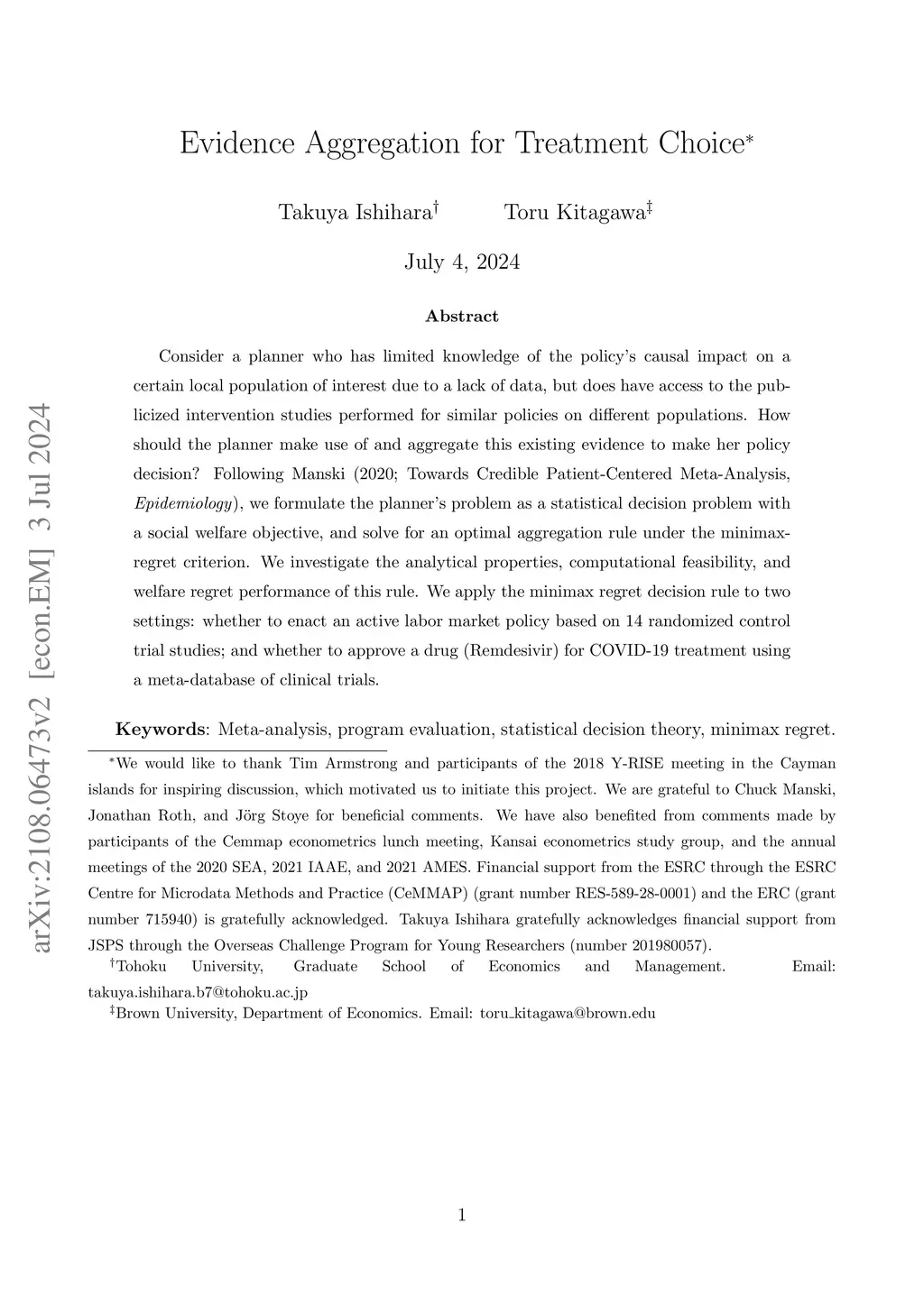 Consider a planner who has limited knowledge of the policy's causal impact on a certain local population of interest due to a lack of data, but does have access to the publicized intervention studies performed for similar policies on different populations. How should the planner make use of and aggregate this existing evidence to make her policy decision? Following Manski (2020; Towards Credible Patient-Centered Meta-Analysis, \textit{Epidemiology}), we formulate the planner's problem as a statistical decision problem with a social welfare objective, and solve for an optimal aggregation rule under the minimax-regret criterion. We investigate the analytical properties, computational feasibility, and welfare regret performance of this rule. We apply the minimax regret decision rule to two settings: whether to enact an active labor market policy based on 14 randomized control trial studies; and whether to approve a drug (Remdesivir) for COVID-19 treatment using a meta-database of clinical trials.
