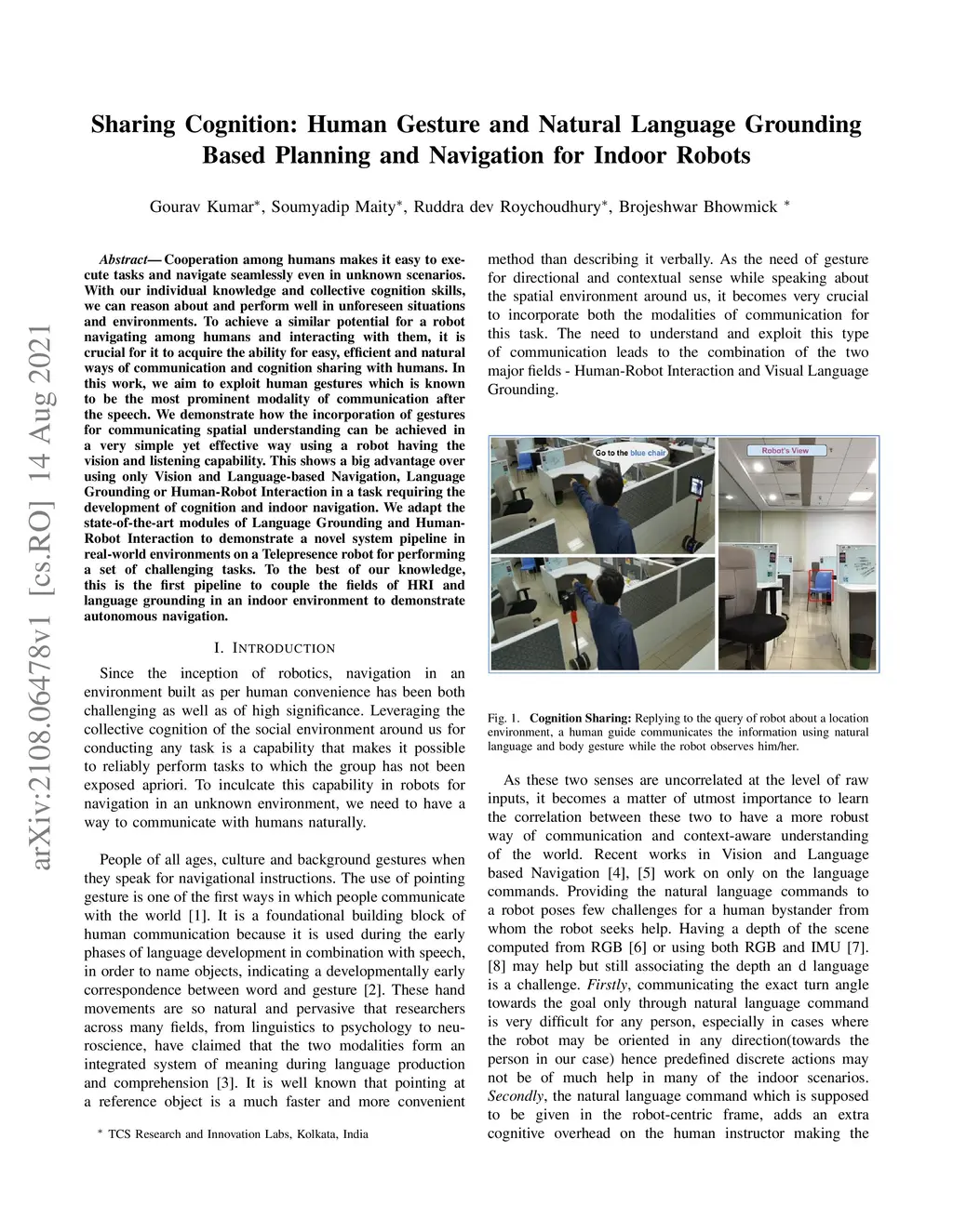 Cooperation among humans makes it easy to execute tasks and navigate seamlessly even in unknown scenarios. With our individual knowledge and collective cognition skills, we can reason about and perform well in unforeseen situations and environments. To achieve a similar potential for a robot navigating among humans and interacting with them, it is crucial for it to acquire the ability for easy, efficient and natural ways of communication and cognition sharing with humans. In this work, we aim to exploit human gestures which is known to be the most prominent modality of communication after the speech. We demonstrate how the incorporation of gestures for communicating spatial understanding can be achieved in a very simple yet effective way using a robot having the vision and listening capability. This shows a big advantage over using only Vision and Language-based Navigation, Language Grounding or Human-Robot Interaction in a task requiring the development of cognition and indoor navigation. We adapt the state-of-the-art modules of Language Grounding and Human-Robot Interaction to demonstrate a novel system pipeline in real-world environments on a Telepresence robot for performing a set of challenging tasks. To the best of our knowledge, this is the first pipeline to couple the fields of HRI and language grounding in an indoor environment to demonstrate autonomous navigation.