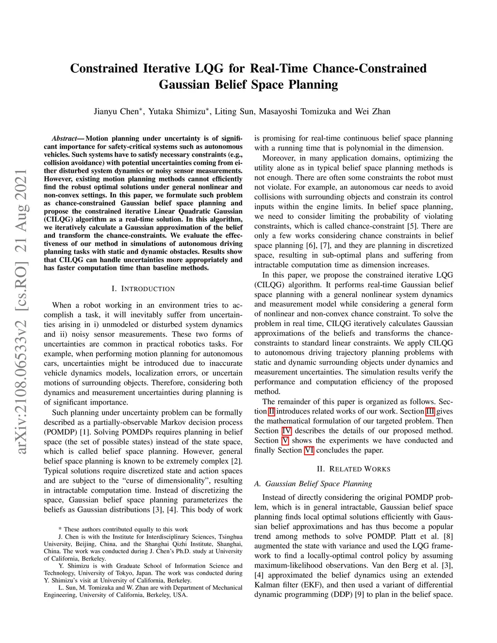 Motion planning under uncertainty is of significant importance for safety-critical systems such as autonomous vehicles. Such systems have to satisfy necessary constraints (e.g., collision avoidance) with potential uncertainties coming from either disturbed system dynamics or noisy sensor measurements. However, existing motion planning methods cannot efficiently find the robust optimal solutions under general nonlinear and non-convex settings. In this paper, we formulate such problem as chance-constrained Gaussian belief space planning and propose the constrained iterative Linear Quadratic Gaussian (CILQG) algorithm as a real-time solution. In this algorithm, we iteratively calculate a Gaussian approximation of the belief and transform the chance-constraints. We evaluate the effectiveness of our method in simulations of autonomous driving planning tasks with static and dynamic obstacles. Results show that CILQG can handle uncertainties more appropriately and has faster computation time than baseline methods.