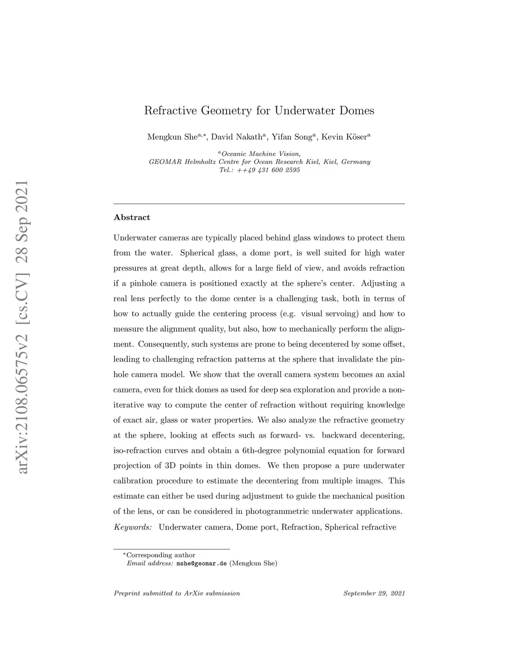 Underwater cameras are typically placed behind glass windows to protect them from the water. Spherical glass, a dome port, is well suited for high water pressures at great depth, allows for a large field of view, and avoids refraction if a pinhole camera is positioned exactly at the sphere's center. Adjusting a real lens perfectly to the dome center is a challenging task, both in terms of how to actually guide the centering process (e.g. visual servoing) and how to measure the alignment quality, but also, how to mechanically perform the alignment. Consequently, such systems are prone to being decentered by some offset, leading to challenging refraction patterns at the sphere that invalidate the pinhole camera model. We show that the overall camera system becomes an axial camera, even for thick domes as used for deep sea exploration and provide a non-iterative way to compute the center of refraction without requiring knowledge of exact air, glass or water properties. We also analyze the refractive geometry at the sphere, looking at effects such as forward- vs. backward decentering, iso-refraction curves and obtain a 6th-degree polynomial equation for forward projection of 3D points in thin domes. We then propose a pure underwater calibration procedure to estimate the decentering from multiple images. This estimate can either be used during adjustment to guide the mechanical position of the lens, or can be considered in photogrammetric underwater applications.