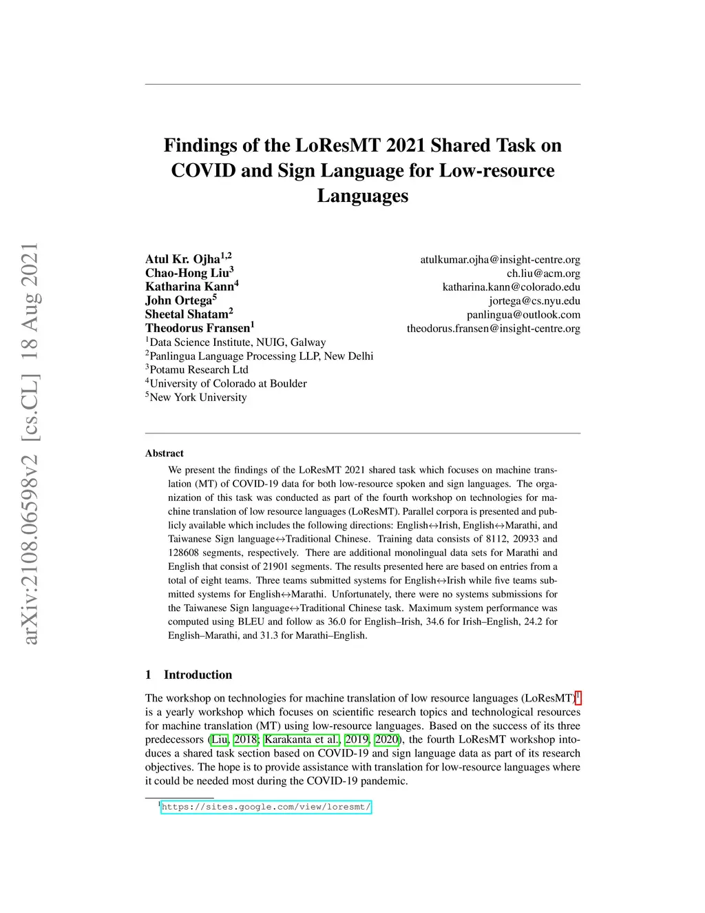 We present the findings of the LoResMT 2021 shared task which focuses on machine translation (MT) of COVID-19 data for both low-resource spoken and sign languages. The organization of this task was conducted as part of the fourth workshop on technologies for machine translation of low resource languages (LoResMT). Parallel corpora is presented and publicly available which includes the following directions: EnglishIrish, EnglishMarathi, and Taiwanese Sign languageTraditional Chinese. Training data consists of 8112, 20933 and 128608 segments, respectively. There are additional monolingual data sets for Marathi and English that consist of 21901 segments. The results presented here are based on entries from a total of eight teams. Three teams submitted systems for EnglishIrish while five teams submitted systems for EnglishMarathi. Unfortunately, there were no systems submissions for the Taiwanese Sign languageTraditional Chinese task. Maximum system performance was computed using BLEU and follow as 36.0 for English--Irish, 34.6 for Irish--English, 24.2 for English--Marathi, and 31.3 for Marathi--English.