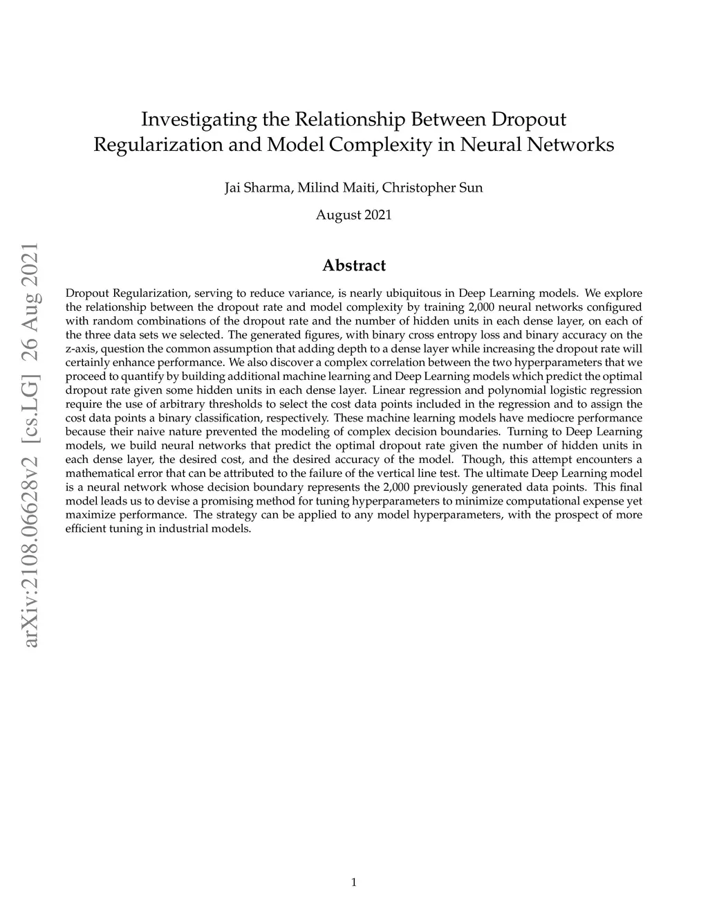 Dropout Regularization, serving to reduce variance, is nearly ubiquitous in Deep Learning models. We explore the relationship between the dropout rate and model complexity by training 2,000 neural networks configured with random combinations of the dropout rate and the number of hidden units in each dense layer, on each of the three data sets we selected. The generated figures, with binary cross entropy loss and binary accuracy on the z-axis, question the common assumption that adding depth to a dense layer while increasing the dropout rate will certainly enhance performance. We also discover a complex correlation between the two hyperparameters that we proceed to quantify by building additional machine learning and Deep Learning models which predict the optimal dropout rate given some hidden units in each dense layer. Linear regression and polynomial logistic regression require the use of arbitrary thresholds to select the cost data points included in the regression and to assign the cost data points a binary classification, respectively. These machine learning models have mediocre performance because their naive nature prevented the modeling of complex decision boundaries. Turning to Deep Learning models, we build neural networks that predict the optimal dropout rate given the number of hidden units in each dense layer, the desired cost, and the desired accuracy of the model. Though, this attempt encounters a mathematical error that can be attributed to the failure of the vertical line test. The ultimate Deep Learning model is a neural network whose decision boundary represents the 2,000 previously generated data points. This final model leads us to devise a promising method for tuning hyperparameters to minimize computational expense yet maximize performance. The strategy can be applied to any model hyperparameters, with the prospect of more efficient tuning in industrial models.