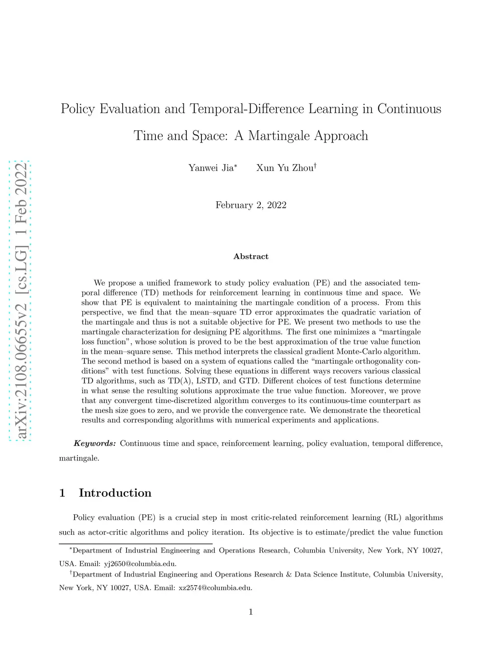 We propose a unified framework to study policy evaluation (PE) and the associated temporal difference (TD) methods for reinforcement learning in continuous time and space. We show that PE is equivalent to maintaining the martingale condition of a process. From this perspective, we find that the mean--square TD error approximates the quadratic variation of the martingale and thus is not a suitable objective for PE. We present two methods to use the martingale characterization for designing PE algorithms. The first one minimizes a "martingale loss function", whose solution is proved to be the best approximation of the true value function in the mean--square sense. This method interprets the classical gradient Monte-Carlo algorithm. The second method is based on a system of equations called the "martingale orthogonality conditions" with test functions. Solving these equations in different ways recovers various classical TD algorithms, such as TD(), LSTD, and GTD. Different choices of test functions determine in what sense the resulting solutions approximate the true value function. Moreover, we prove that any convergent time-discretized algorithm converges to its continuous-time counterpart as the mesh size goes to zero, and we provide the convergence rate. We demonstrate the theoretical results and corresponding algorithms with numerical experiments and applications.