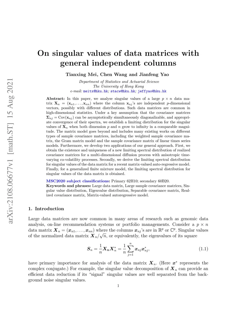 In this paper, we analyse singular values of a large data matrix where the column 's are independent -dimensional vectors, possibly with different distributions. Such data matrices are common in high-dimensional statistics. Under a key assumption that the covariance matrices can be asymptotically simultaneously diagonalizable, and appropriate convergence of their spectra, we establish a limiting distribution for the singular values of when both dimension and grow to infinity in a comparable magnitude. The matrix model goes beyond and includes many existing works on different types of sample covariance matrices, including the weighted sample covariance matrix, the Gram matrix model and the sample covariance matrix of linear times series models. Furthermore, we develop two applications of our general approach. First, we obtain the existence and uniqueness of a new limiting spectral distribution of realized covariance matrices for a multi-dimensional diffusion process with anisotropic time-varying co-volatility processes. Secondly, we derive the limiting spectral distribution for singular values of the data matrix for a recent matrix-valued auto-regressive model. Finally, for a generalized finite mixture model, the limiting spectral distribution for singular values of the data matrix is obtained.