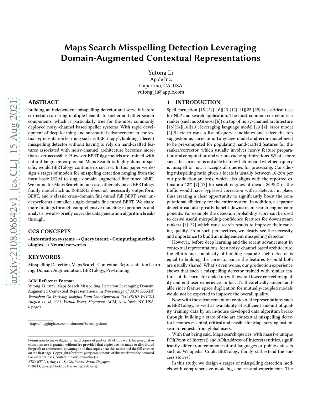 Building an independent misspelling detector and serve it before correction can bring multiple benefits to speller and other search components, which is particularly true for the most commonly deployed noisy-channel based speller systems. With rapid development of deep learning and substantial advancement in contextual representation learning such as BERTology, building a decent misspelling detector without having to rely on hand-crafted features associated with noisy-channel architecture becomes more-than-ever accessible. However BERTolgy models are trained with natural language corpus but Maps Search is highly domain specific, would BERTology continue its success. In this paper we design 4 stages of models for misspeling detection ranging from the most basic LSTM to single-domain augmented fine-tuned BERT. We found for Maps Search in our case, other advanced BERTology family model such as RoBERTa does not necessarily outperform BERT, and a classic cross-domain fine-tuned full BERT even underperforms a smaller single-domain fine-tuned BERT. We share more findings through comprehensive modeling experiments and analysis, we also briefly cover the data generation algorithm breakthrough.
