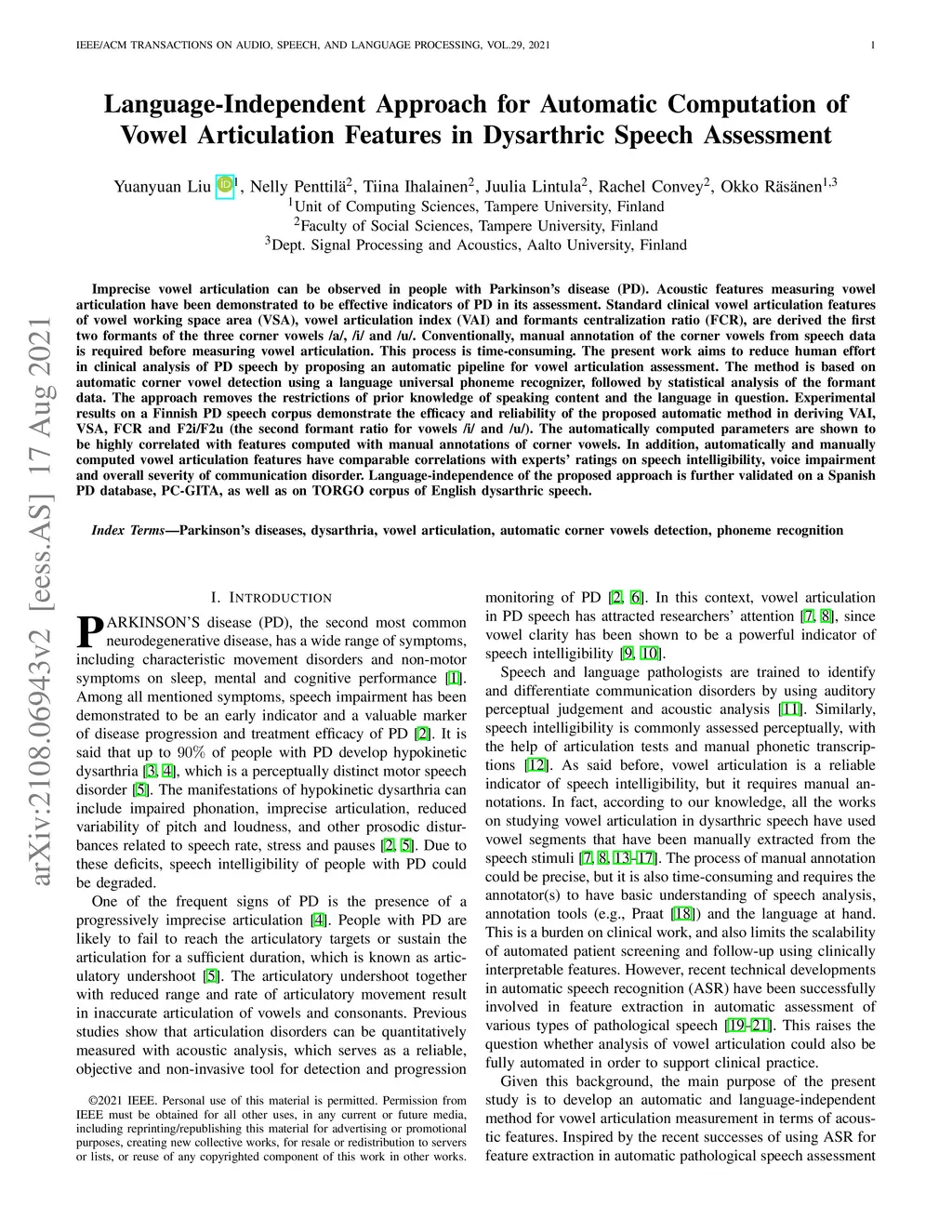 Imprecise vowel articulation can be observed in people with Parkinson's disease (PD). Acoustic features measuring vowel articulation have been demonstrated to be effective indicators of PD in its assessment. Standard clinical vowel articulation features of vowel working space area (VSA), vowel articulation index (VAI) and formants centralization ratio (FCR), are derived the first two formants of the three corner vowels /a/, /i/ and /u/. Conventionally, manual annotation of the corner vowels from speech data is required before measuring vowel articulation. This process is time-consuming. The present work aims to reduce human effort in clinical analysis of PD speech by proposing an automatic pipeline for vowel articulation assessment. The method is based on automatic corner vowel detection using a language universal phoneme recognizer, followed by statistical analysis of the formant data. The approach removes the restrictions of prior knowledge of speaking content and the language in question. Experimental results on a Finnish PD speech corpus demonstrate the efficacy and reliability of the proposed automatic method in deriving VAI, VSA, FCR and F2i/F2u (the second formant ratio for vowels /i/ and /u/). The automatically computed parameters are shown to be highly correlated with features computed with manual annotations of corner vowels. In addition, automatically and manually computed vowel articulation features have comparable correlations with experts' ratings on speech intelligibility, voice impairment and overall severity of communication disorder. Language-independence of the proposed approach is further validated on a Spanish PD database, PC-GITA, as well as on TORGO corpus of English dysarthric speech.