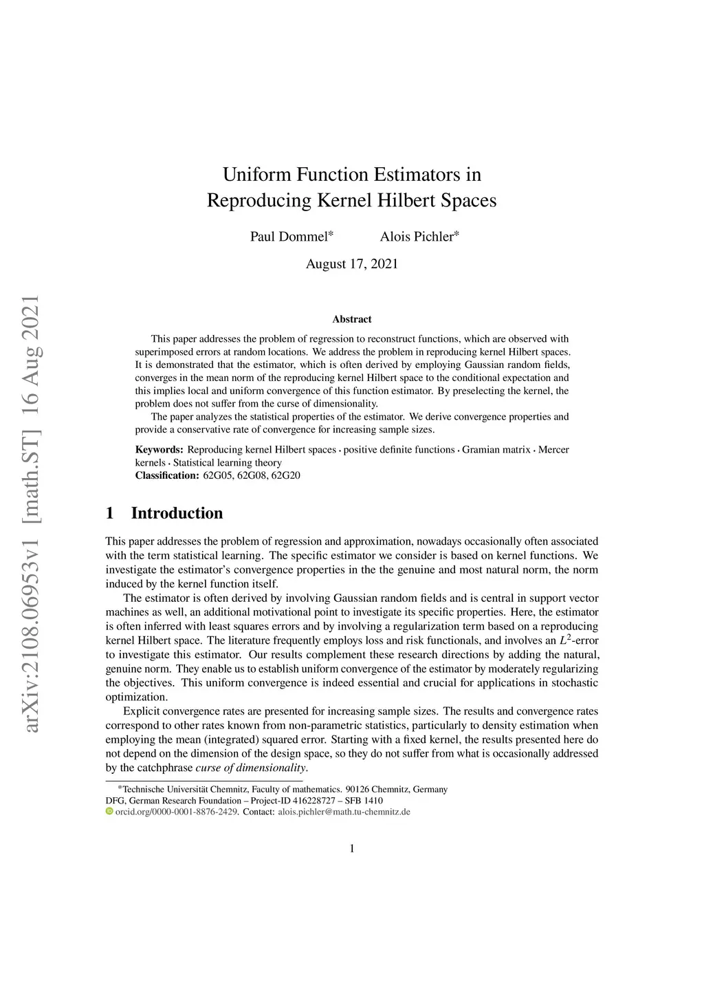 This paper addresses the problem of regression to reconstruct functions, which are observed with superimposed errors at random locations. We address the problem in reproducing kernel Hilbert spaces. It is demonstrated that the estimator, which is often derived by employing Gaussian random fields, converges in the mean norm of the reproducing kernel Hilbert space to the conditional expectation and this implies local and uniform convergence of this function estimator. By preselecting the kernel, the problem does not suffer from the curse of dimensionality. The paper analyzes the statistical properties of the estimator. We derive convergence properties and provide a conservative rate of convergence for increasing sample sizes.