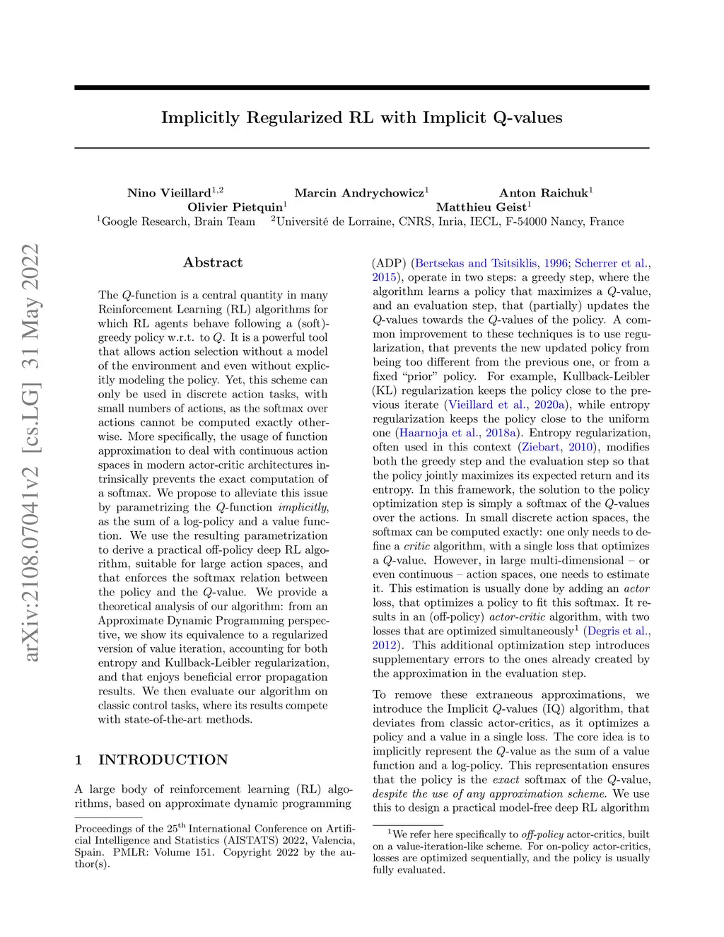 The -function is a central quantity in many Reinforcement Learning (RL) algorithms for which RL agents behave following a (soft)-greedy policy w.r.t. to . It is a powerful tool that allows action selection without a model of the environment and even without explicitly modeling the policy. Yet, this scheme can only be used in discrete action tasks, with small numbers of actions, as the softmax cannot be computed exactly otherwise. Especially the usage of function approximation, to deal with continuous action spaces in modern actor-critic architectures, intrinsically prevents the exact computation of a softmax. We propose to alleviate this issue by parametrizing the -function implicitly, as the sum of a log-policy and of a value function. We use the resulting parametrization to derive a practical off-policy deep RL algorithm, suitable for large action spaces, and that enforces the softmax relation between the policy and the -value. We provide a theoretical analysis of our algorithm: from an Approximate Dynamic Programming perspective, we show its equivalence to a regularized version of value iteration, accounting for both entropy and Kullback-Leibler regularization, and that enjoys beneficial error propagation results. We then evaluate our algorithm on classic control tasks, where its results compete with state-of-the-art methods.