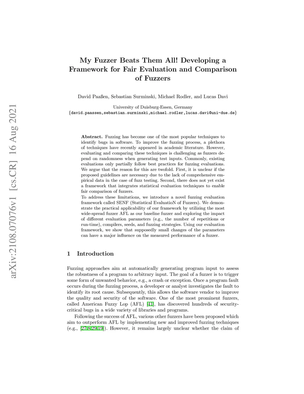 Fuzzing has become one of the most popular techniques to identify bugs in software. To improve the fuzzing process, a plethora of techniques have recently appeared in academic literature. However, evaluating and comparing these techniques is challenging as fuzzers depend on randomness when generating test inputs. Commonly, existing evaluations only partially follow best practices for fuzzing evaluations. We argue that the reason for this are twofold. First, it is unclear if the proposed guidelines are necessary due to the lack of comprehensive empirical data in the case of fuzz testing. Second, there does not yet exist a framework that integrates statistical evaluation techniques to enable fair comparison of fuzzers. To address these limitations, we introduce a novel fuzzing evaluation framework called SENF (Statistical EvaluatioN of Fuzzers). We demonstrate the practical applicability of our framework by utilizing the most wide-spread fuzzer AFL as our baseline fuzzer and exploring the impact of different evaluation parameters (e.g., the number of repetitions or run-time), compilers, seeds, and fuzzing strategies. Using our evaluation framework, we show that supposedly small changes of the parameters can have a major influence on the measured performance of a fuzzer.