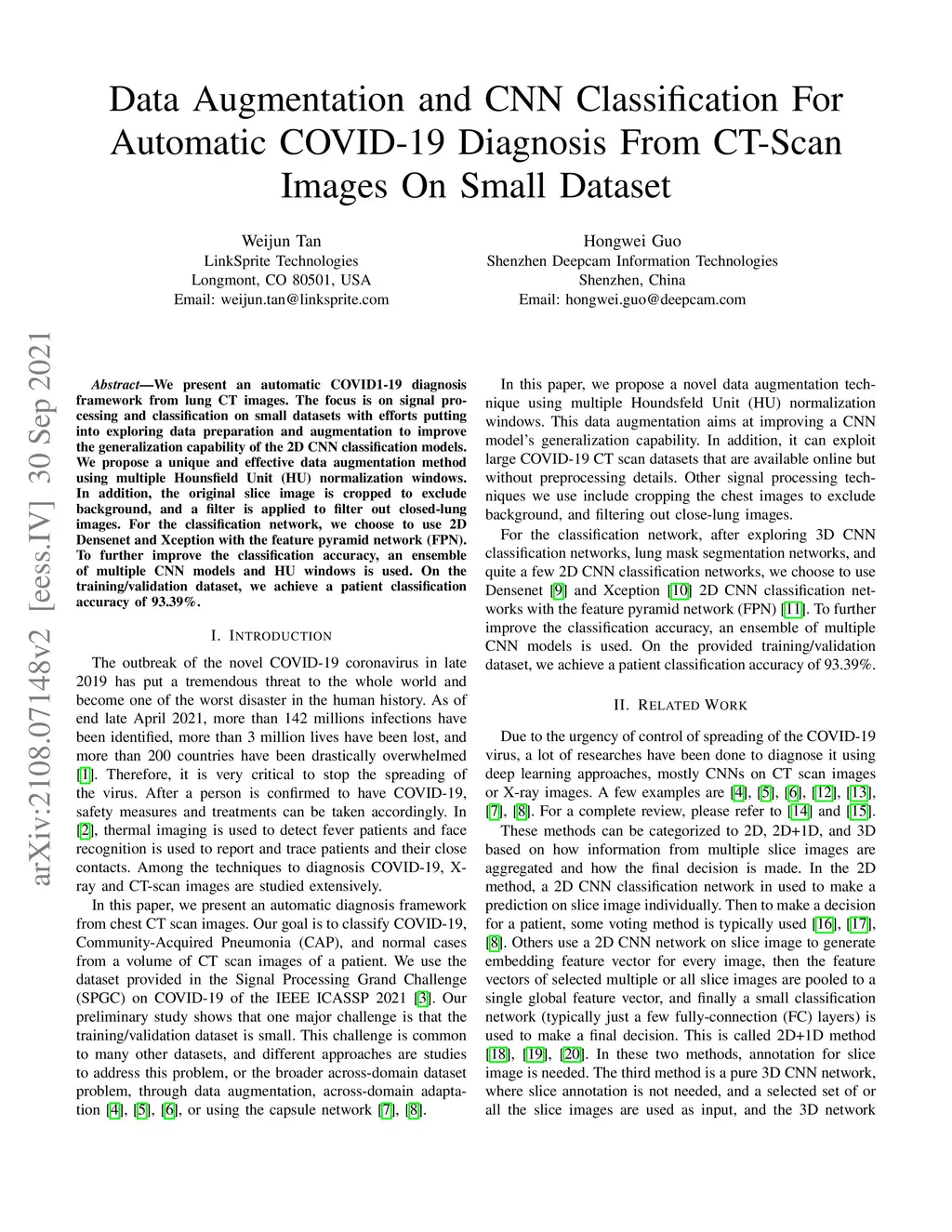 We present an automatic COVID1-19 diagnosis framework from lung CT images. The focus is on signal processing and classification on small datasets with efforts putting into exploring data preparation and augmentation to improve the generalization capability of the 2D CNN classification models. We propose a unique and effective data augmentation method using multiple Hounsfield Unit (HU) normalization windows. In addition, the original slice image is cropped to exclude background, and a filter is applied to filter out closed-lung images. For the classification network, we choose to use 2D Densenet and Xception with the feature pyramid network (FPN). To further improve the classification accuracy, an ensemble of multiple CNN models and HU windows is used. On the training/validation dataset, we achieve a patient classification accuracy of 93.39%.