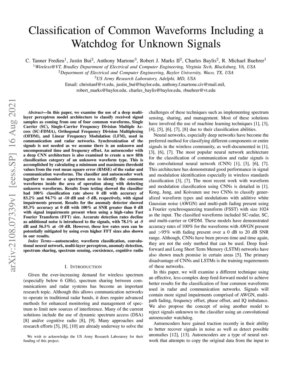In this paper, we examine the use of a deep multi-layer perceptron model architecture to classify received signal samples as coming from one of four common waveforms, Single Carrier (SC), Single-Carrier Frequency Division Multiple Access (SC-FDMA), Orthogonal Frequency Division Multiplexing (OFDM), and Linear Frequency Modulation (LFM), used in communication and radar networks. Synchronization of the signals is not needed as we assume there is an unknown and uncompensated time and frequency offset. An autoencoder with a deep CNN architecture is also examined to create a new fifth classification category of an unknown waveform type. This is accomplished by calculating a minimum and maximum threshold values from the root mean square error (RMSE) of the radar and communication waveforms. The classifier and autoencoder work together to monitor a spectrum area to identify the common waveforms inside the area of operation along with detecting unknown waveforms. Results from testing showed the classifier had 100\% classification rate above 0 dB with accuracy of 83.2\% and 94.7\% at -10 dB and -5 dB, respectively, with signal impairments present. Results for the anomaly detector showed 85.3\% accuracy at 0 dB with 100\% at SNR greater than 0 dB with signal impairments present when using a high-value Fast Fourier Transform (FFT) size. Accurate detection rates decline as additional noise is introduced to the signals, with 78.1\% at -5 dB and 56.5\% at -10 dB. However, these low rates seen can be potentially mitigated by using even higher FFT sizes also shown in our results.