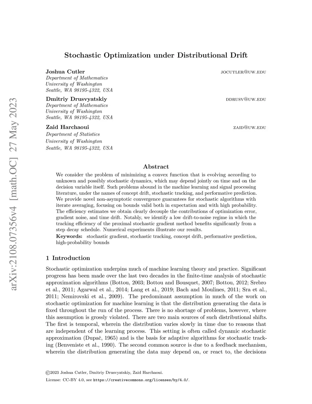 We consider the problem of minimizing a convex function that is evolving according to unknown and possibly stochastic dynamics, which may depend jointly on time and on the decision variable itself. Such problems abound in the machine learning and signal processing literature, under the names of concept drift, stochastic tracking, and performative prediction. We provide novel non-asymptotic convergence guarantees for stochastic algorithms with iterate averaging, focusing on bounds valid both in expectation and with high probability. The efficiency estimates we obtain clearly decouple the contributions of optimization error, gradient noise, and time drift. Notably, we identify a low drift-to-noise regime in which the tracking efficiency of the proximal stochastic gradient method benefits significantly from a step decay schedule. Numerical experiments illustrate our results.