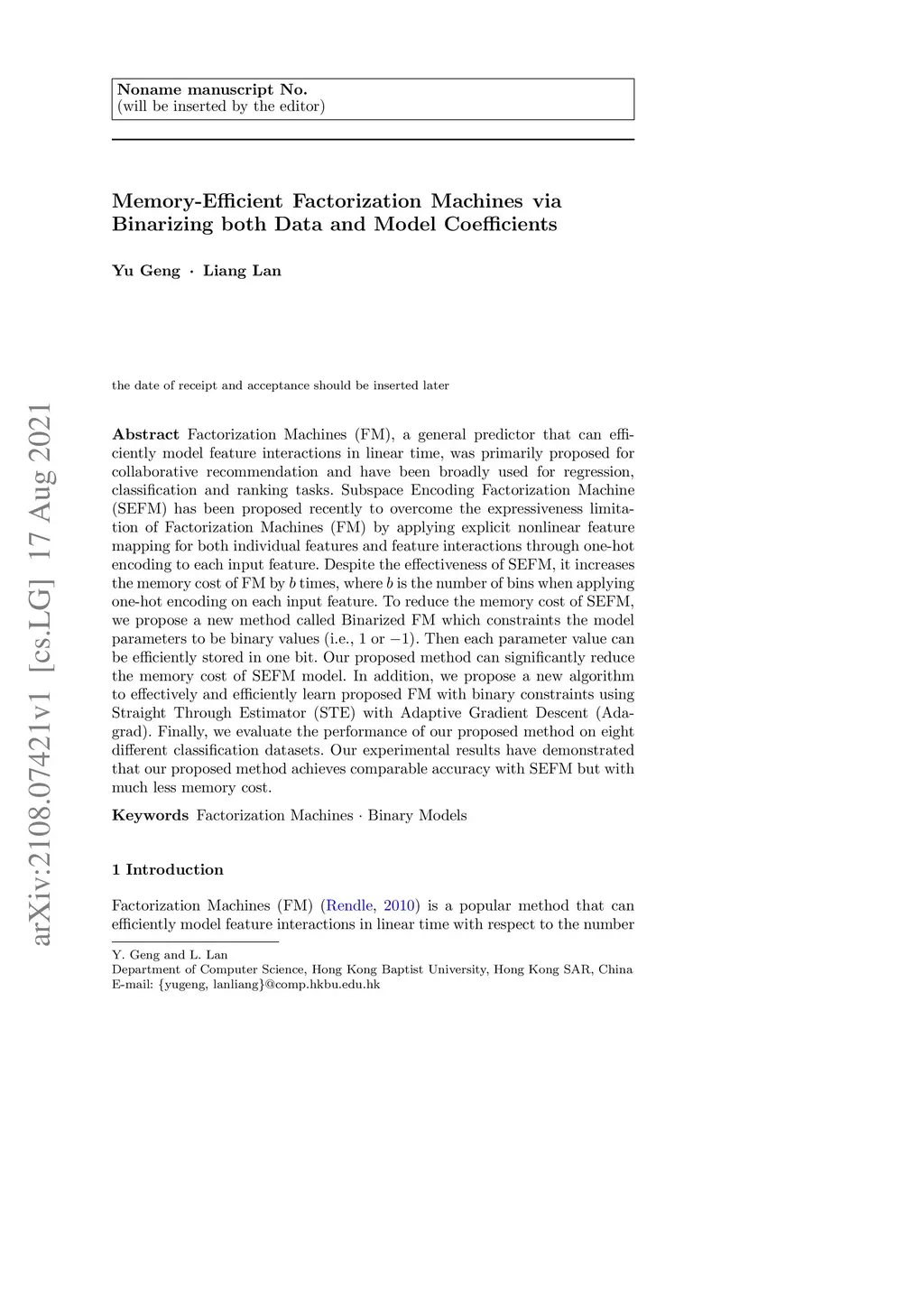 Factorization Machines (FM), a general predictor that can efficiently model feature interactions in linear time, was primarily proposed for collaborative recommendation and have been broadly used for regression, classification and ranking tasks. Subspace Encoding Factorization Machine (SEFM) has been proposed recently to overcome the expressiveness limitation of Factorization Machines (FM) by applying explicit nonlinear feature mapping for both individual features and feature interactions through one-hot encoding to each input feature. Despite the effectiveness of SEFM, it increases the memory cost of FM by times, where is the number of bins when applying one-hot encoding on each input feature. To reduce the memory cost of SEFM, we propose a new method called Binarized FM which constraints the model parameters to be binary values (i.e., 1 or ). Then each parameter value can be efficiently stored in one bit. Our proposed method can significantly reduce the memory cost of SEFM model. In addition, we propose a new algorithm to effectively and efficiently learn proposed FM with binary constraints using Straight Through Estimator (STE) with Adaptive Gradient Descent (Adagrad). Finally, we evaluate the performance of our proposed method on eight different classification datasets. Our experimental results have demonstrated that our proposed method achieves comparable accuracy with SEFM but with much less memory cost.