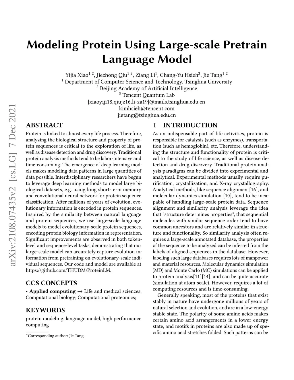 Protein is linked to almost every life process. Therefore, analyzing the biological structure and property of protein sequences is critical to the exploration of life, as well as disease detection and drug discovery. Traditional protein analysis methods tend to be labor-intensive and time-consuming. The emergence of deep learning models makes modeling data patterns in large quantities of data possible. Interdisciplinary researchers have begun to leverage deep learning methods to model large biological datasets, e.g. using long short-term memory and convolutional neural network for protein sequence classification. After millions of years of evolution, evolutionary information is encoded in protein sequences. Inspired by the similarity between natural language and protein sequences, we use large-scale language models to model evolutionary-scale protein sequences, encoding protein biology information in representation. Significant improvements are observed in both token-level and sequence-level tasks, demonstrating that our large-scale model can accurately capture evolution information from pretraining on evolutionary-scale individual sequences. Our code and model are available at https://github.com/THUDM/ProteinLM.