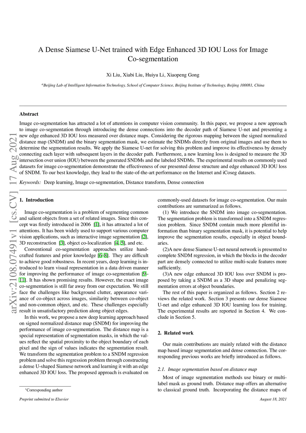 Image co-segmentation has attracted a lot of attentions in computer vision community. In this paper, we propose a new approach to image co-segmentation through introducing the dense connections into the decoder path of Siamese U-net and presenting a new edge enhanced 3D IOU loss measured over distance maps. Considering the rigorous mapping between the signed normalized distance map (SNDM) and the binary segmentation mask, we estimate the SNDMs directly from original images and use them to determine the segmentation results. We apply the Siamese U-net for solving this problem and improve its effectiveness by densely connecting each layer with subsequent layers in the decoder path. Furthermore, a new learning loss is designed to measure the 3D intersection over union (IOU) between the generated SNDMs and the labeled SNDMs. The experimental results on commonly used datasets for image co-segmentation demonstrate the effectiveness of our presented dense structure and edge enhanced 3D IOU loss of SNDM. To our best knowledge, they lead to the state-of-the-art performance on the Internet and iCoseg datasets.