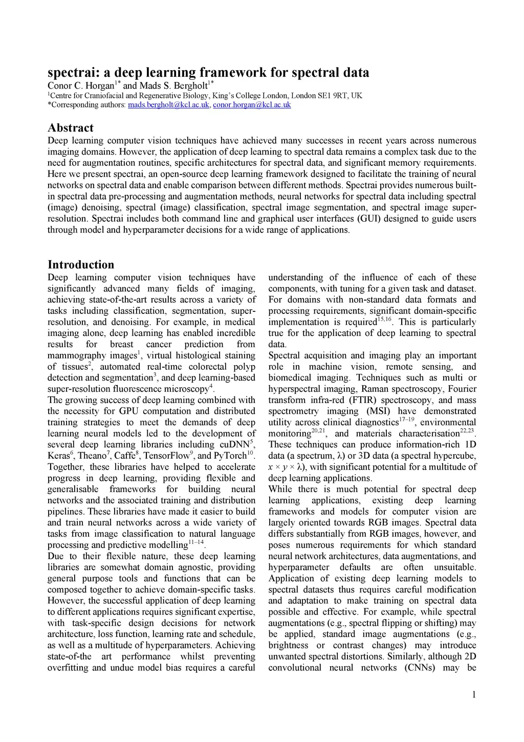 Deep learning computer vision techniques have achieved many successes in recent years across numerous imaging domains. However, the application of deep learning to spectral data remains a complex task due to the need for augmentation routines, specific architectures for spectral data, and significant memory requirements. Here we present spectrai, an open-source deep learning framework designed to facilitate the training of neural networks on spectral data and enable comparison between different methods. Spectrai provides numerous built-in spectral data pre-processing and augmentation methods, neural networks for spectral data including spectral (image) denoising, spectral (image) classification, spectral image segmentation, and spectral image super-resolution. Spectrai includes both command line and graphical user interfaces (GUI) designed to guide users through model and hyperparameter decisions for a wide range of applications.