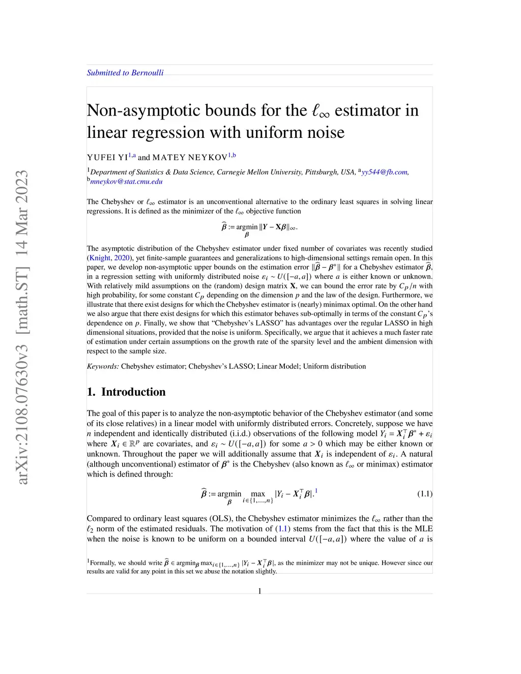 The Chebyshev or estimator is an unconventional alternative to the ordinary least squares in solving linear regressions. It is defined as the minimizer of the objective function \begin{align*} \hat{\boldsymbol{\beta}} := \arg\min_{\boldsymbol{\beta}} \|\boldsymbol{Y} - \mathbf{X}\boldsymbol{\beta}\|_{\infty}. \end{align*} The asymptotic distribution of the Chebyshev estimator under fixed number of covariates were recently studied (Knight, 2020), yet finite sample guarantees and generalizations to high-dimensional settings remain open. In this paper, we develop non-asymptotic upper bounds on the estimation error for a Chebyshev estimator , in a regression setting with uniformly distributed noise where is either known or unknown. With relatively mild assumptions on the (random) design matrix , we can bound the error rate by with high probability, for some constant depending on the dimension and the law of the design. Furthermore, we illustrate that there exist designs for which the Chebyshev estimator is (nearly) minimax optimal. In addition we show that "Chebyshev's LASSO" has advantages over the regular LASSO in high dimensional situations, provided that the noise is uniform. Specifically, we argue that it achieves a much faster rate of estimation under certain assumptions on the growth rate of the sparsity level and the ambient dimension with respect to the sample size.