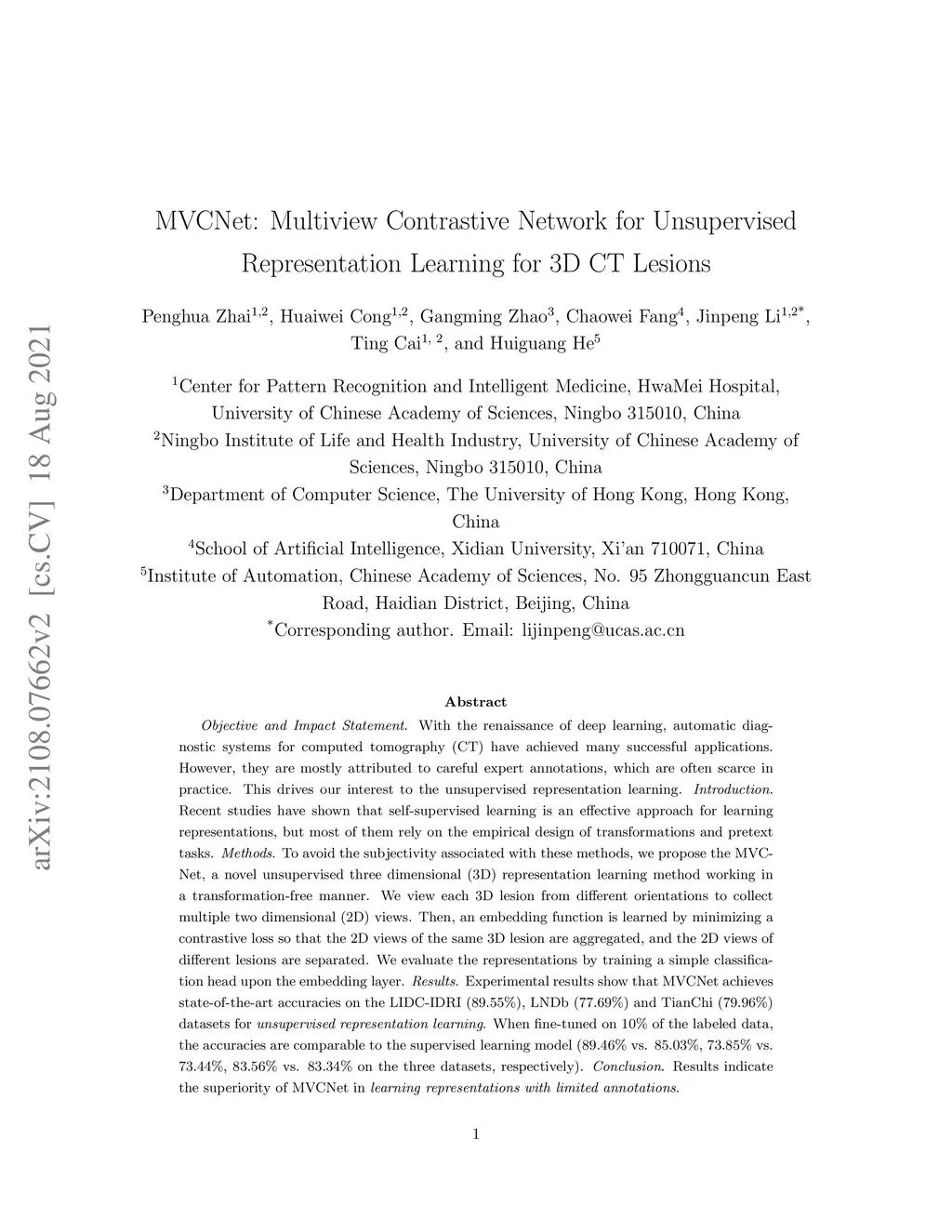 With the renaissance of deep learning, automatic diagnostic systems for computed tomography (CT) have achieved many successful applications. However, they are mostly attributed to careful expert annotations, which are often scarce in practice. This drives our interest to the unsupervised representation learning. Recent studies have shown that self-supervised learning is an effective approach for learning representations, but most of them rely on the empirical design of transformations and pretext tasks. To avoid the subjectivity associated with these methods, we propose the MVCNet, a novel unsupervised three dimensional (3D) representation learning method working in a transformation-free manner. We view each 3D lesion from different orientations to collect multiple two dimensional (2D) views. Then, an embedding function is learned by minimizing a contrastive loss so that the 2D views of the same 3D lesion are aggregated, and the 2D views of different lesions are separated. We evaluate the representations by training a simple classification head upon the embedding layer. Experimental results show that MVCNet achieves state-of-the-art accuracies on the LIDC-IDRI (89.55%), LNDb (77.69%) and TianChi (79.96%) datasets for unsupervised representation learning. When fine-tuned on 10% of the labeled data, the accuracies are comparable to the supervised learning model (89.46% vs. 85.03%, 73.85% vs. 73.44%, 83.56% vs. 83.34% on the three datasets, respectively), indicating the superiority of MVCNet in learning representations with limited annotations. Code is released at: https://github.com/penghuazhai/MVCNet.
