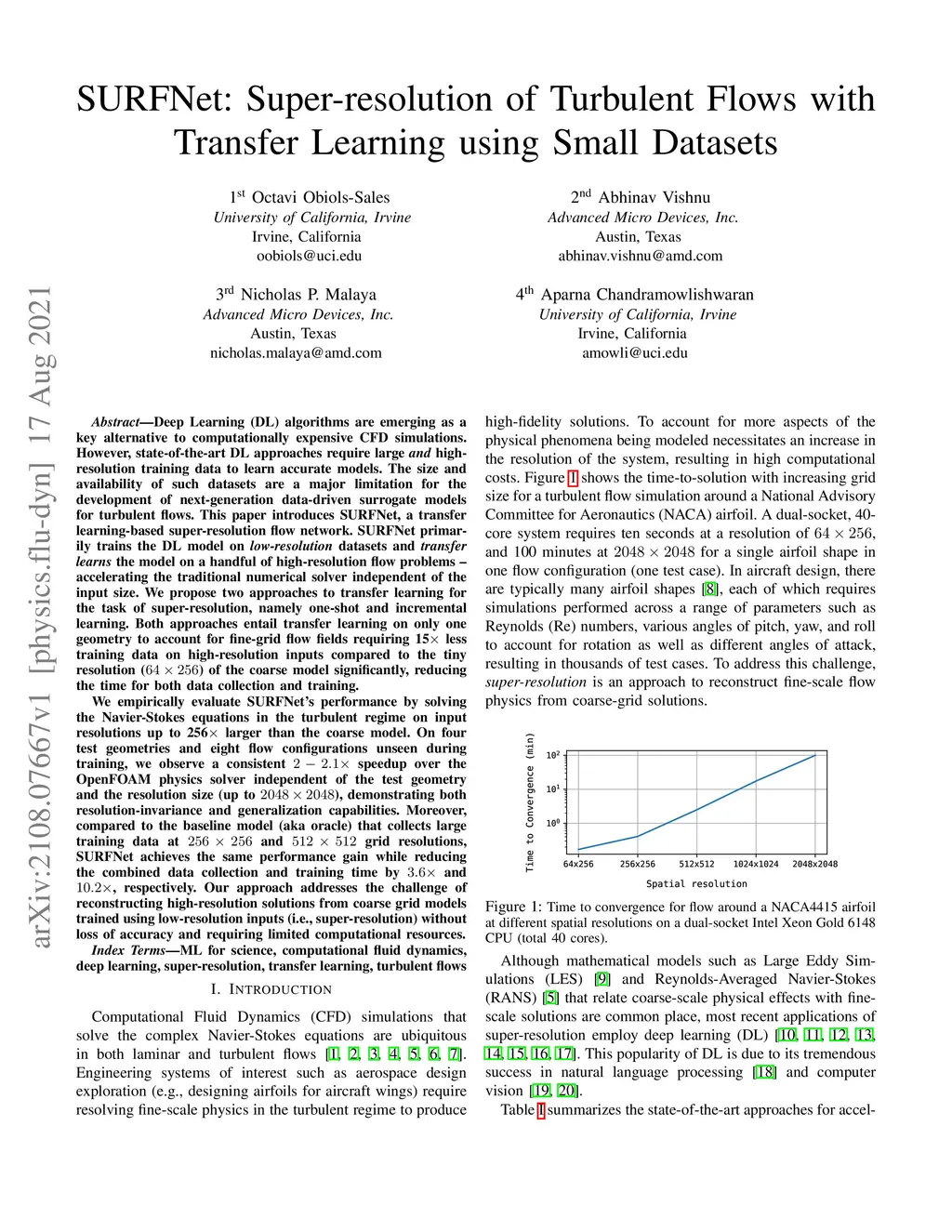 Deep Learning (DL) algorithms are emerging as a key alternative to computationally expensive CFD simulations. However, state-of-the-art DL approaches require large and high-resolution training data to learn accurate models. The size and availability of such datasets are a major limitation for the development of next-generation data-driven surrogate models for turbulent flows. This paper introduces SURFNet, a transfer learning-based super-resolution flow network. SURFNet primarily trains the DL model on low-resolution datasets and transfer learns the model on a handful of high-resolution flow problems - accelerating the traditional numerical solver independent of the input size. We propose two approaches to transfer learning for the task of super-resolution, namely one-shot and incremental learning. Both approaches entail transfer learning on only one geometry to account for fine-grid flow fields requiring 15x less training data on high-resolution inputs compared to the tiny resolution (64x256) of the coarse model, significantly reducing the time for both data collection and training. We empirically evaluate SURFNet's performance by solving the Navier-Stokes equations in the turbulent regime on input resolutions up to 256x larger than the coarse model. On four test geometries and eight flow configurations unseen during training, we observe a consistent 2-2.1x speedup over the OpenFOAM physics solver independent of the test geometry and the resolution size (up to 2048x2048), demonstrating both resolution-invariance and generalization capabilities. Our approach addresses the challenge of reconstructing high-resolution solutions from coarse grid models trained using low-resolution inputs (super-resolution) without loss of accuracy and requiring limited computational resources.