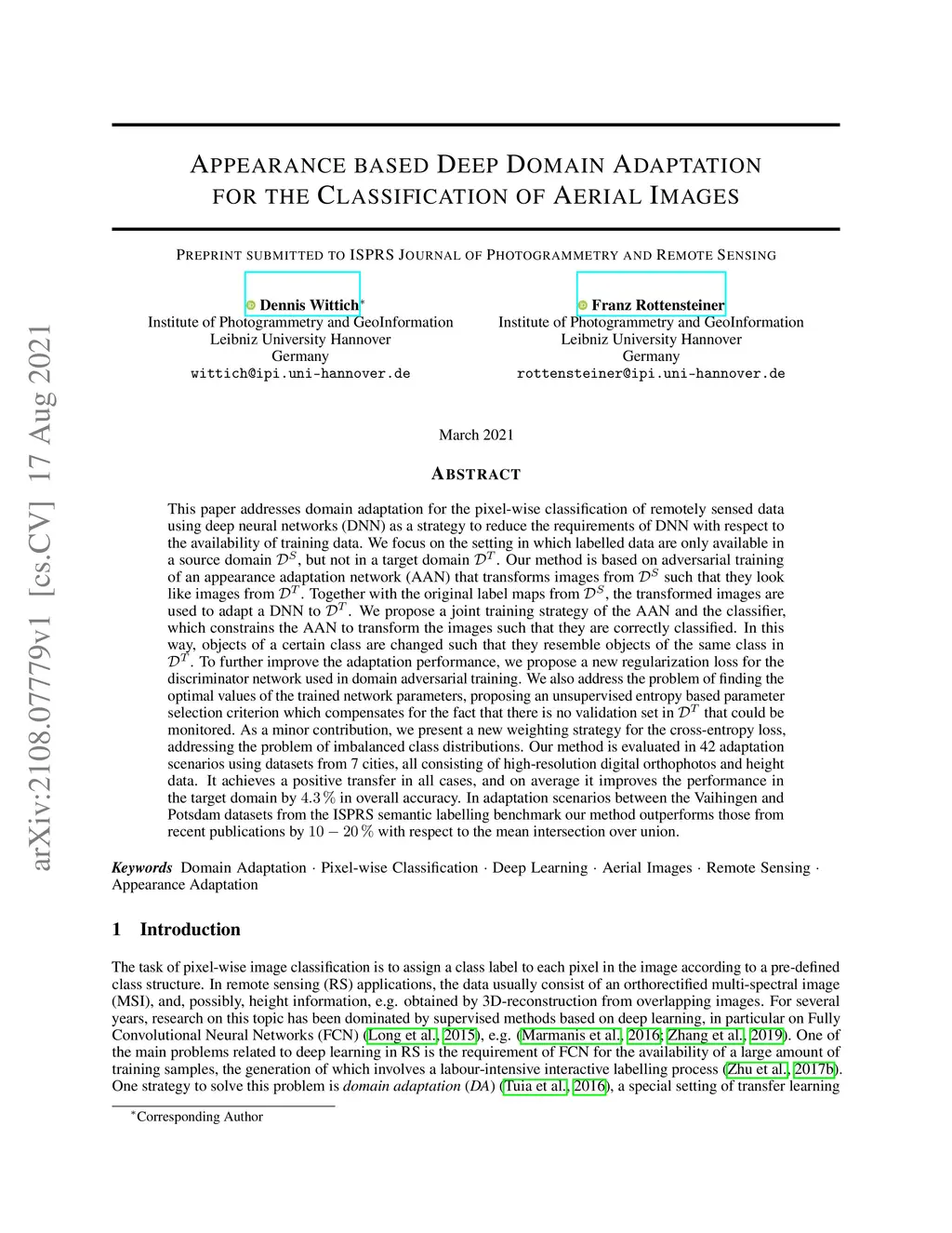 This paper addresses domain adaptation for the pixel-wise classification of remotely sensed data using deep neural networks (DNN) as a strategy to reduce the requirements of DNN with respect to the availability of training data. We focus on the setting in which labelled data are only available in a source domain DS, but not in a target domain DT. Our method is based on adversarial training of an appearance adaptation network (AAN) that transforms images from DS such that they look like images from DT. Together with the original label maps from DS, the transformed images are used to adapt a DNN to DT. We propose a joint training strategy of the AAN and the classifier, which constrains the AAN to transform the images such that they are correctly classified. In this way, objects of a certain class are changed such that they resemble objects of the same class in DT. To further improve the adaptation performance, we propose a new regularization loss for the discriminator network used in domain adversarial training. We also address the problem of finding the optimal values of the trained network parameters, proposing an unsupervised entropy based parameter selection criterion which compensates for the fact that there is no validation set in DT that could be monitored. As a minor contribution, we present a new weighting strategy for the cross-entropy loss, addressing the problem of imbalanced class distributions. Our method is evaluated in 42 adaptation scenarios using datasets from 7 cities, all consisting of high-resolution digital orthophotos and height data. It achieves a positive transfer in all cases, and on average it improves the performance in the target domain by 4.3% in overall accuracy. In adaptation scenarios between datasets from the ISPRS semantic labelling benchmark our method outperforms those from recent publications by 10-20% with respect to the mean intersection over union.