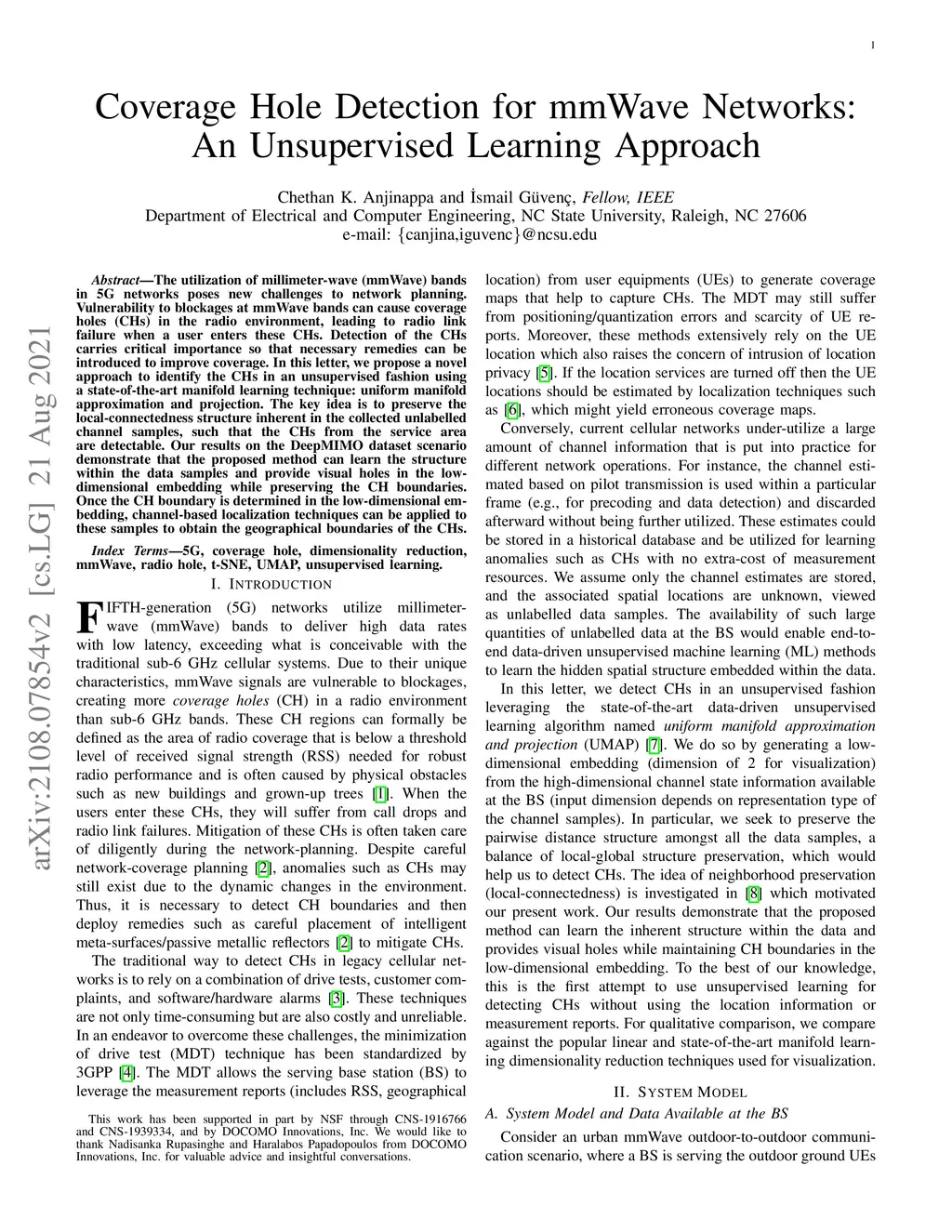 The utilization of millimeter-wave (mmWave) bands in 5G networks poses new challenges to network planning. Vulnerability to blockages at mmWave bands can cause coverage holes (CHs) in the radio environment, leading to radio link failure when a user enters these CHs. Detection of the CHs carries critical importance so that necessary remedies can be introduced to improve coverage. In this letter, we propose a novel approach to identify the CHs in an unsupervised fashion using a state-of-the-art manifold learning technique: uniform manifold approximation and projection. The key idea is to preserve the local-connectedness structure inherent in the collected unlabelled channel samples, such that the CHs from the service area are detectable. Our results on the DeepMIMO dataset scenario demonstrate that the proposed method can learn the structure within the data samples and provide visual holes in the low-dimensional embedding while preserving the CH boundaries. Once the CH boundary is determined in the low-dimensional embedding, channel-based localization techniques can be applied to these samples to obtain the geographical boundaries of the CHs.