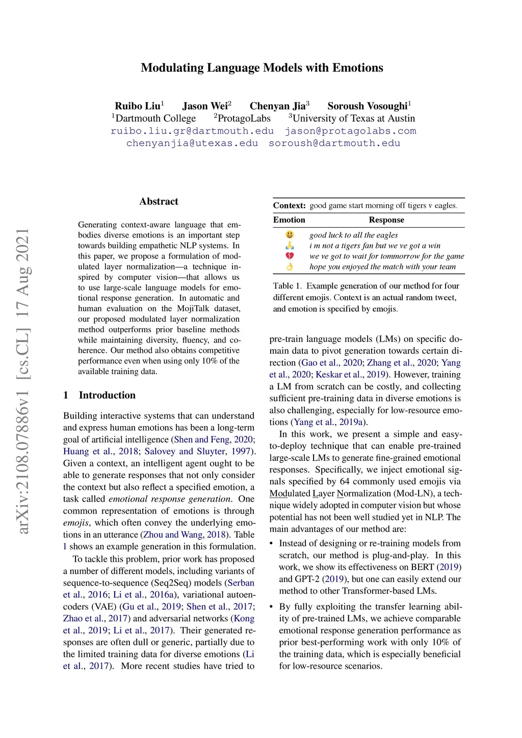 Generating context-aware language that embodies diverse emotions is an important step towards building empathetic NLP systems. In this paper, we propose a formulation of modulated layer normalization -- a technique inspired by computer vision -- that allows us to use large-scale language models for emotional response generation. In automatic and human evaluation on the MojiTalk dataset, our proposed modulated layer normalization method outperforms prior baseline methods while maintaining diversity, fluency, and coherence. Our method also obtains competitive performance even when using only 10% of the available training data.