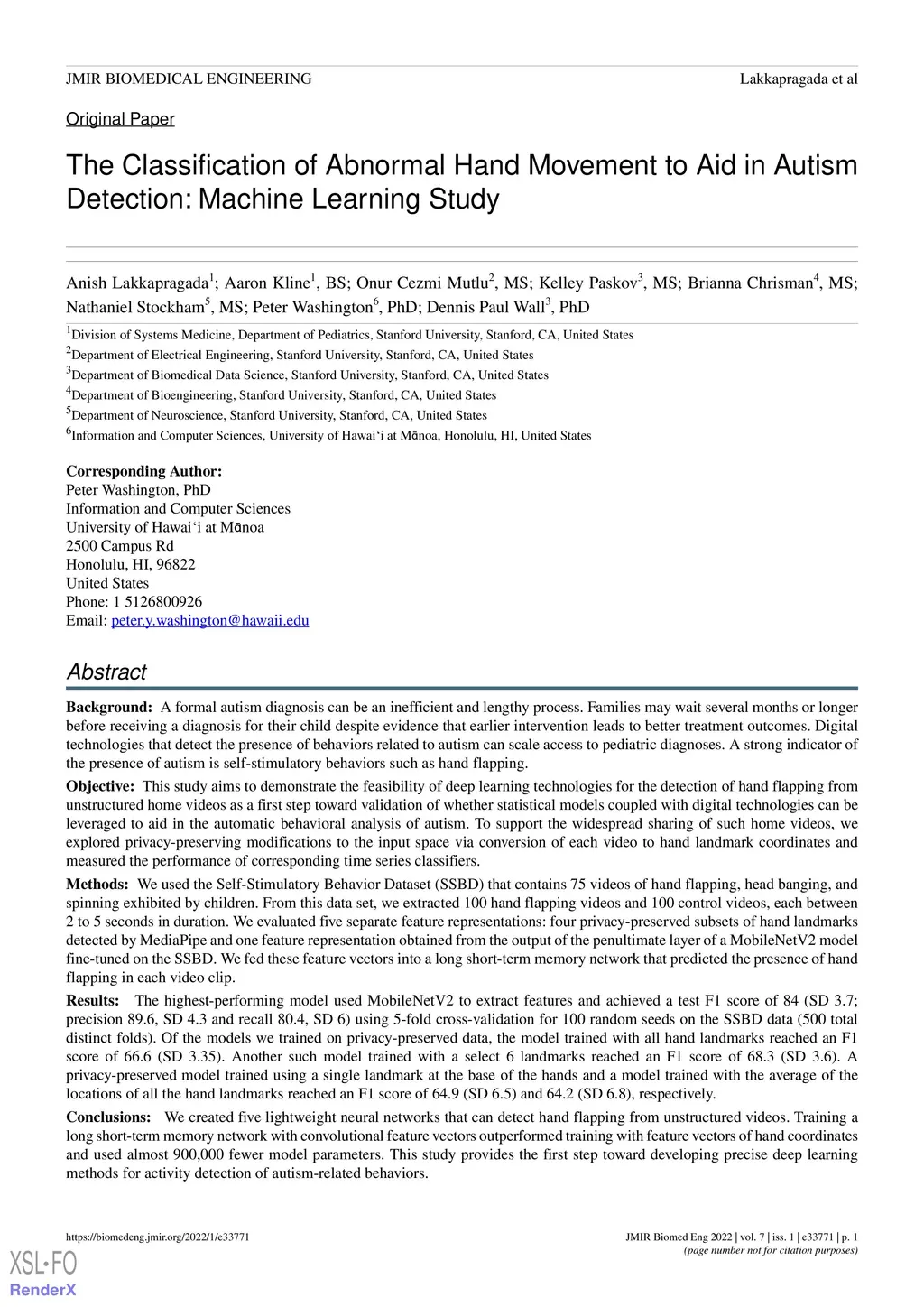 A formal autism diagnosis can be an inefficient and lengthy process. Families may wait months or longer before receiving a diagnosis for their child despite evidence that earlier intervention leads to better treatment outcomes. Digital technologies which detect the presence of behaviors related to autism can scale access to pediatric diagnoses. This work aims to demonstrate the feasibility of deep learning technologies for detecting hand flapping from unstructured home videos as a first step towards validating whether models and digital technologies can be leveraged to aid with autism diagnoses. We used the Self-Stimulatory Behavior Dataset (SSBD), which contains 75 videos of hand flapping, head banging, and spinning exhibited by children. From all the hand flapping videos, we extracted 100 positive and control videos of hand flapping, each between 2 to 5 seconds in duration. Utilizing both landmark-driven-approaches and MobileNet V2's pretrained convolutional layers, our highest performing model achieved a testing F1 score of 84% (90% precision and 80% recall) when evaluating with 5-fold cross validation 100 times. This work provides the first step towards developing precise deep learning methods for activity detection of autism-related behaviors.