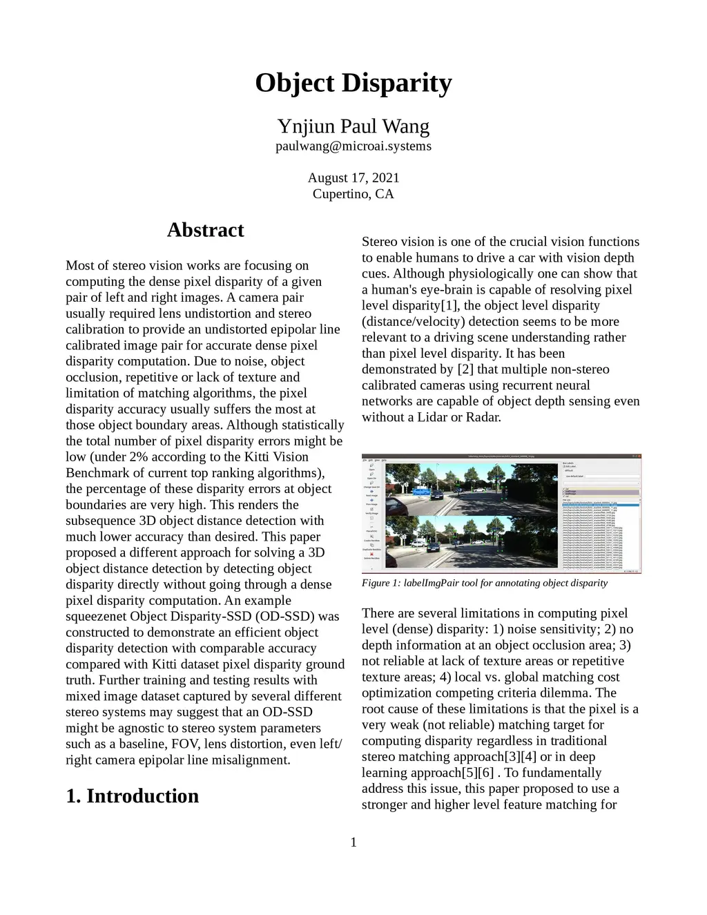 Most of stereo vision works are focusing on computing the dense pixel disparity of a given pair of left and right images. A camera pair usually required lens undistortion and stereo calibration to provide an undistorted epipolar line calibrated image pair for accurate dense pixel disparity computation. Due to noise, object occlusion, repetitive or lack of texture and limitation of matching algorithms, the pixel disparity accuracy usually suffers the most at those object boundary areas. Although statistically the total number of pixel disparity errors might be low (under 2% according to the Kitti Vision Benchmark of current top ranking algorithms), the percentage of these disparity errors at object boundaries are very high. This renders the subsequence 3D object distance detection with much lower accuracy than desired. This paper proposed a different approach for solving a 3D object distance detection by detecting object disparity directly without going through a dense pixel disparity computation. An example squeezenet Object Disparity-SSD (OD-SSD) was constructed to demonstrate an efficient object disparity detection with comparable accuracy compared with Kitti dataset pixel disparity ground truth. Further training and testing results with mixed image dataset captured by several different stereo systems may suggest that an OD-SSD might be agnostic to stereo system parameters such as a baseline, FOV, lens distortion, even left/right camera epipolar line misalignment.