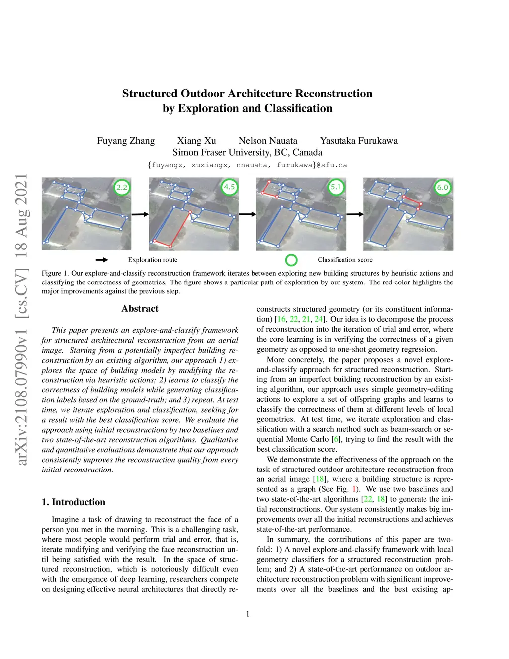 This paper presents an explore-and-classify framework for structured architectural reconstruction from an aerial image. Starting from a potentially imperfect building reconstruction by an existing algorithm, our approach 1) explores the space of building models by modifying the reconstruction via heuristic actions; 2) learns to classify the correctness of building models while generating classification labels based on the ground-truth, and 3) repeat. At test time, we iterate exploration and classification, seeking for a result with the best classification score. We evaluate the approach using initial reconstructions by two baselines and two state-of-the-art reconstruction algorithms. Qualitative and quantitative evaluations demonstrate that our approach consistently improves the reconstruction quality from every initial reconstruction.
