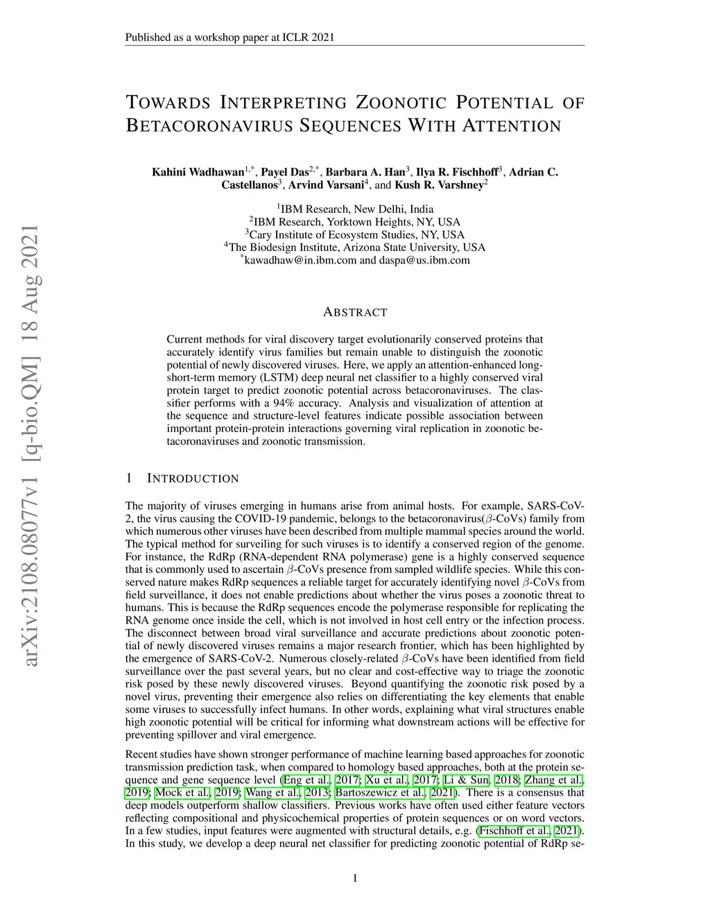 Current methods for viral discovery target evolutionarily conserved proteins that accurately identify virus families but remain unable to distinguish the zoonotic potential of newly discovered viruses. Here, we apply an attention-enhanced long-short-term memory (LSTM) deep neural net classifier to a highly conserved viral protein target to predict zoonotic potential across betacoronaviruses. The classifier performs with a 94% accuracy. Analysis and visualization of attention at the sequence and structure-level features indicate possible association between important protein-protein interactions governing viral replication in zoonotic betacoronaviruses and zoonotic transmission.