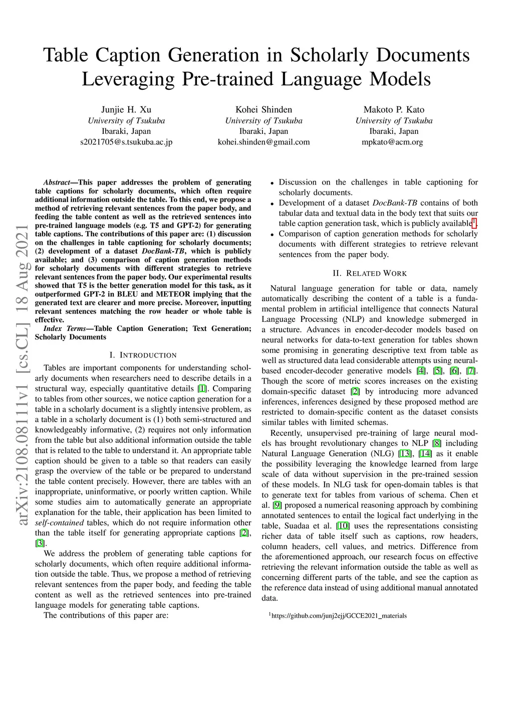 This paper addresses the problem of generating table captions for scholarly documents, which often require additional information outside the table. To this end, we propose a method of retrieving relevant sentences from the paper body, and feeding the table content as well as the retrieved sentences into pre-trained language models (e.g. T5 and GPT-2) for generating table captions. The contributions of this paper are: (1) discussion on the challenges in table captioning for scholarly documents; (2) development of a dataset DocBank-TB, which is publicly available; and (3) comparison of caption generation methods for scholarly documents with different strategies to retrieve relevant sentences from the paper body. Our experimental results showed that T5 is the better generation model for this task, as it outperformed GPT-2 in BLEU and METEOR implying that the generated text are clearer and more precise. Moreover, inputting relevant sentences matching the row header or whole table is effective.