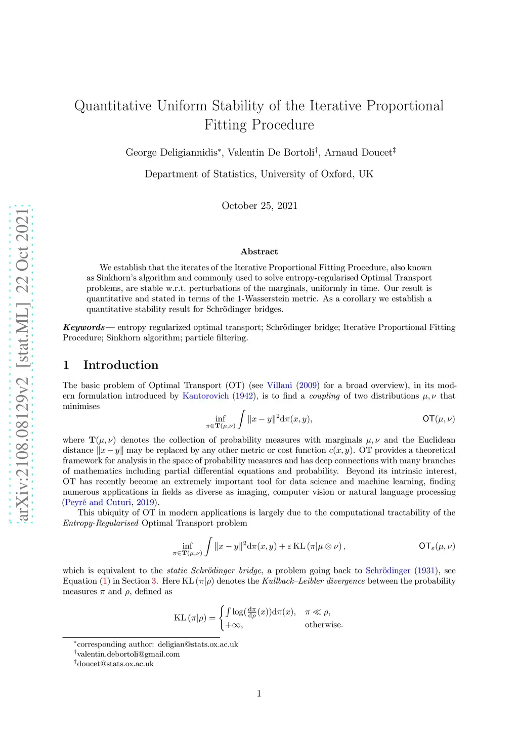 We establish the uniform in time stability, w.r.t. the marginals, of the Iterative Proportional Fitting Procedure, also known as Sinkhorn algorithm, used to solve entropy-regularised Optimal Transport problems. Our result is quantitative and stated in terms of the 1-Wasserstein metric. As a corollary we establish a quantitative stability result for Schr\"odinger bridges.