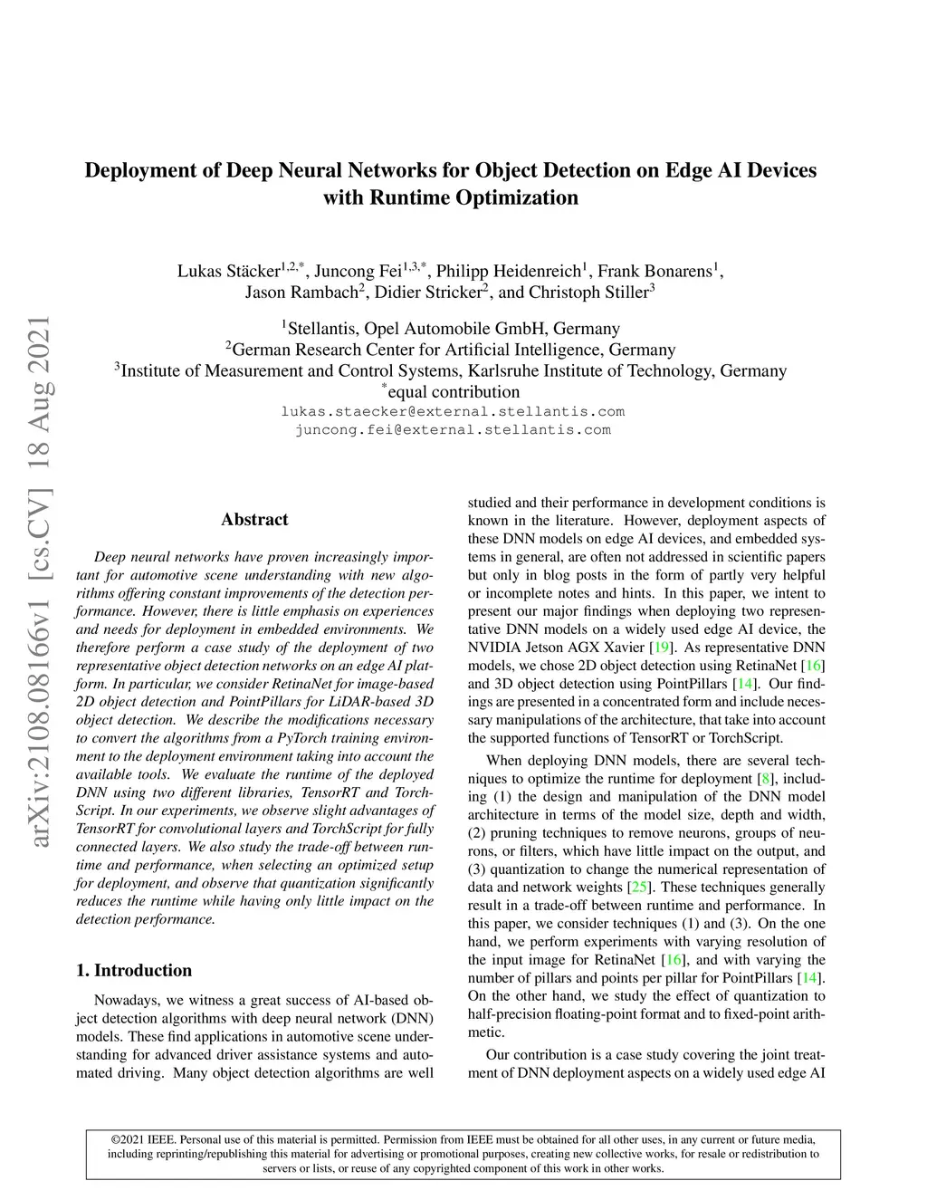 Deep neural networks have proven increasingly important for automotive scene understanding with new algorithms offering constant improvements of the detection performance. However, there is little emphasis on experiences and needs for deployment in embedded environments. We therefore perform a case study of the deployment of two representative object detection networks on an edge AI platform. In particular, we consider RetinaNet for image-based 2D object detection and PointPillars for LiDAR-based 3D object detection. We describe the modifications necessary to convert the algorithms from a PyTorch training environment to the deployment environment taking into account the available tools. We evaluate the runtime of the deployed DNN using two different libraries, TensorRT and TorchScript. In our experiments, we observe slight advantages of TensorRT for convolutional layers and TorchScript for fully connected layers. We also study the trade-off between runtime and performance, when selecting an optimized setup for deployment, and observe that quantization significantly reduces the runtime while having only little impact on the detection performance.