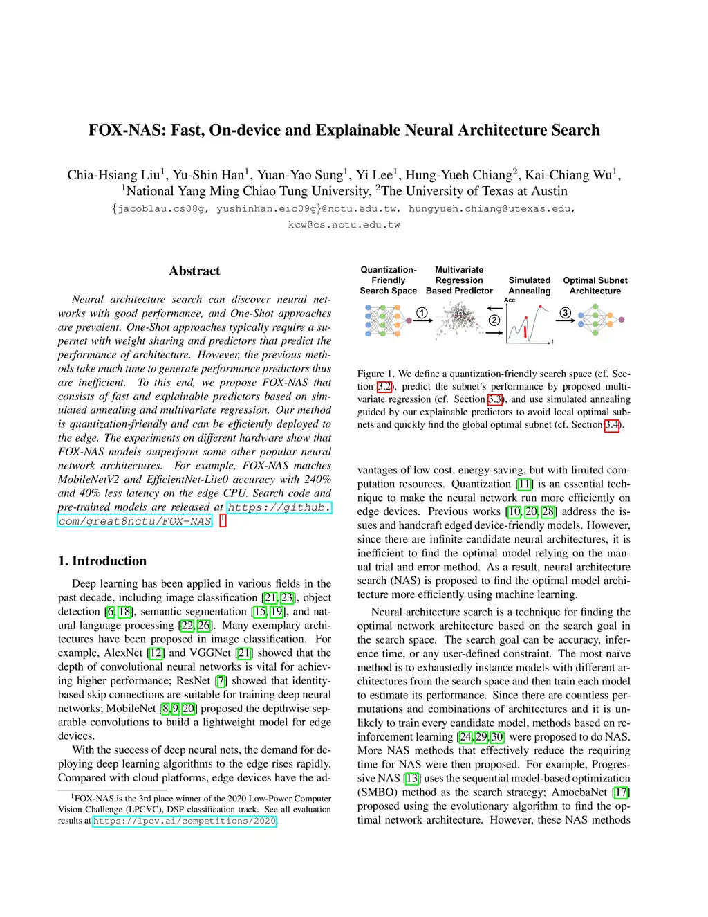 Neural architecture search can discover neural networks with good performance, and One-Shot approaches are prevalent. One-Shot approaches typically require a supernet with weight sharing and predictors that predict the performance of architecture. However, the previous methods take much time to generate performance predictors thus are inefficient. To this end, we propose FOX-NAS that consists of fast and explainable predictors based on simulated annealing and multivariate regression. Our method is quantization-friendly and can be efficiently deployed to the edge. The experiments on different hardware show that FOX-NAS models outperform some other popular neural network architectures. For example, FOX-NAS matches MobileNetV2 and EfficientNet-Lite0 accuracy with 240% and 40% less latency on the edge CPU. FOX-NAS is the 3rd place winner of the 2020 Low-Power Computer Vision Challenge (LPCVC), DSP classification track. See all evaluation results at https://lpcv.ai/competitions/2020. Search code and pre-trained models are released at https://github.com/great8nctu/FOX-NAS.
