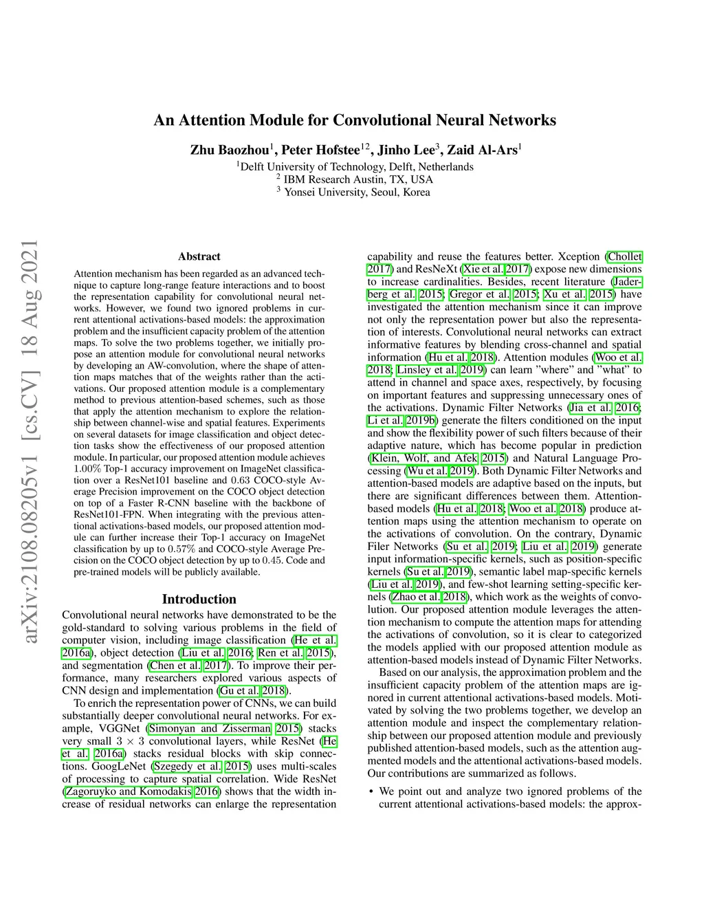 Attention mechanism has been regarded as an advanced technique to capture long-range feature interactions and to boost the representation capability for convolutional neural networks. However, we found two ignored problems in current attentional activations-based models: the approximation problem and the insufficient capacity problem of the attention maps. To solve the two problems together, we initially propose an attention module for convolutional neural networks by developing an AW-convolution, where the shape of attention maps matches that of the weights rather than the activations. Our proposed attention module is a complementary method to previous attention-based schemes, such as those that apply the attention mechanism to explore the relationship between channel-wise and spatial features. Experiments on several datasets for image classification and object detection tasks show the effectiveness of our proposed attention module. In particular, our proposed attention module achieves 1.00% Top-1 accuracy improvement on ImageNet classification over a ResNet101 baseline and 0.63 COCO-style Average Precision improvement on the COCO object detection on top of a Faster R-CNN baseline with the backbone of ResNet101-FPN. When integrating with the previous attentional activations-based models, our proposed attention module can further increase their Top-1 accuracy on ImageNet classification by up to 0.57% and COCO-style Average Precision on the COCO object detection by up to 0.45. Code and pre-trained models will be publicly available.