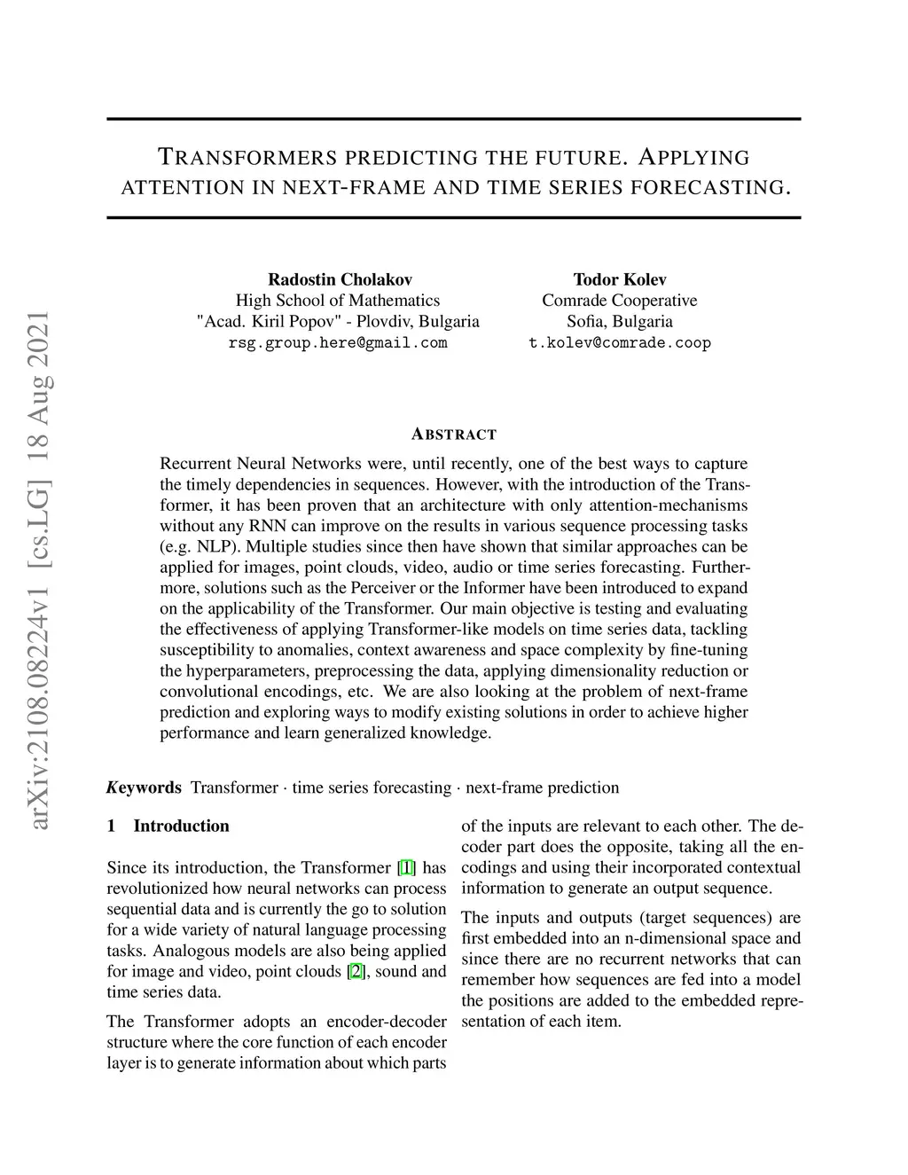 Recurrent Neural Networks were, until recently, one of the best ways to capture the timely dependencies in sequences. However, with the introduction of the Transformer, it has been proven that an architecture with only attention-mechanisms without any RNN can improve on the results in various sequence processing tasks (e.g. NLP). Multiple studies since then have shown that similar approaches can be applied for images, point clouds, video, audio or time series forecasting. Furthermore, solutions such as the Perceiver or the Informer have been introduced to expand on the applicability of the Transformer. Our main objective is testing and evaluating the effectiveness of applying Transformer-like models on time series data, tackling susceptibility to anomalies, context awareness and space complexity by fine-tuning the hyperparameters, preprocessing the data, applying dimensionality reduction or convolutional encodings, etc. We are also looking at the problem of next-frame prediction and exploring ways to modify existing solutions in order to achieve higher performance and learn generalized knowledge.