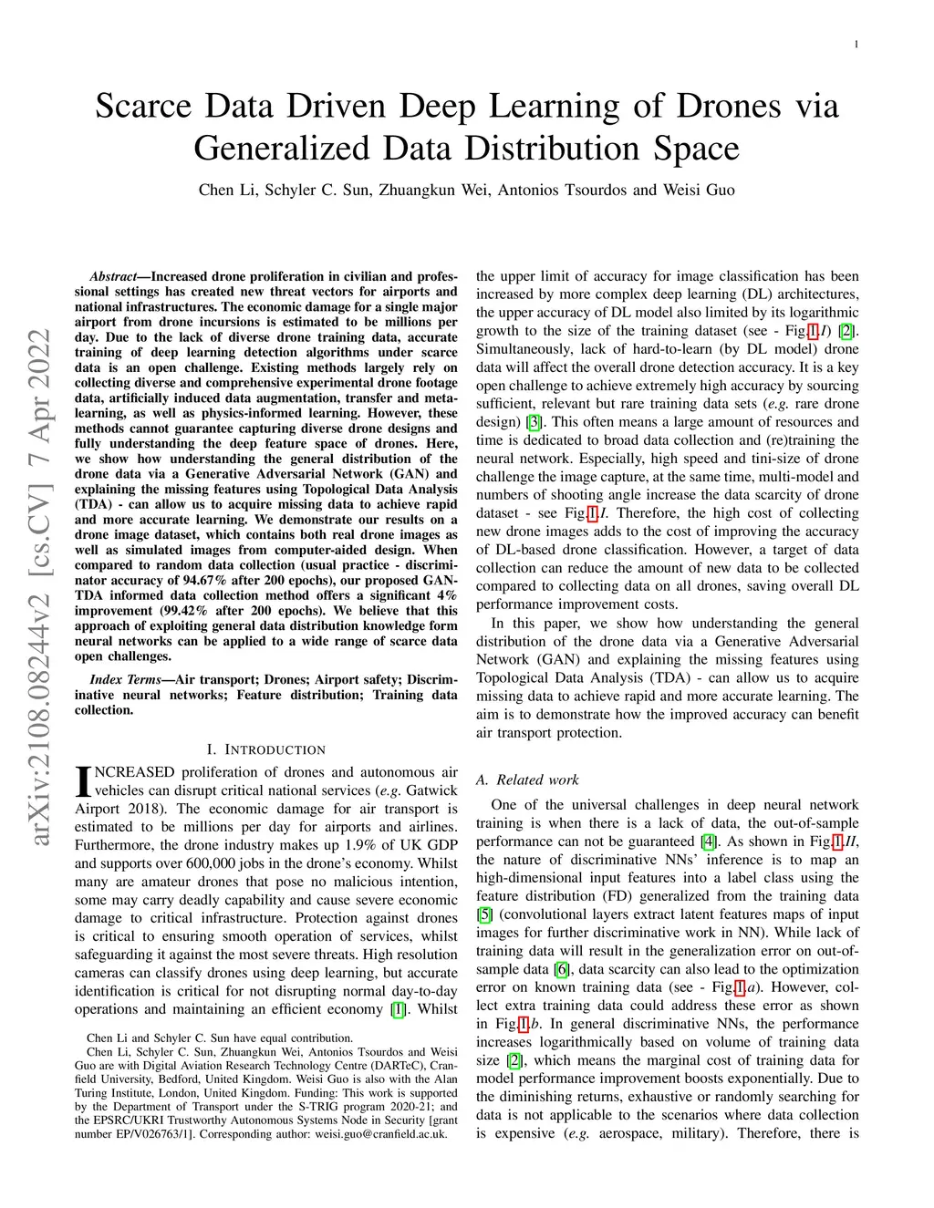 Increased drone proliferation in civilian and professional settings has created new threat vectors for airports and national infrastructures. The economic damage for a single major airport from drone incursions is estimated to be millions per day. Due to the lack of diverse drone training data, accurate training of deep learning detection algorithms under scarce data is an open challenge. Existing methods largely rely on collecting diverse and comprehensive experimental drone footage data, artificially induced data augmentation, transfer and meta-learning, as well as physics-informed learning. However, these methods cannot guarantee capturing diverse drone designs and fully understanding the deep feature space of drones. Here, we show how understanding the general distribution of the drone data via a Generative Adversarial Network (GAN) and explaining the missing features using Topological Data Analysis (TDA) - can allow us to acquire missing data to achieve rapid and more accurate learning. We demonstrate our results on a drone image dataset, which contains both real drone images as well as simulated images from computer-aided design. When compared to random data collection (usual practice - discriminator accuracy of 94.67\% after 200 epochs), our proposed GAN-TDA informed data collection method offers a significant 4\% improvement (99.42\% after 200 epochs). We believe that this approach of exploiting general data distribution knowledge form neural networks can be applied to a wide range of scarce data open challenges.