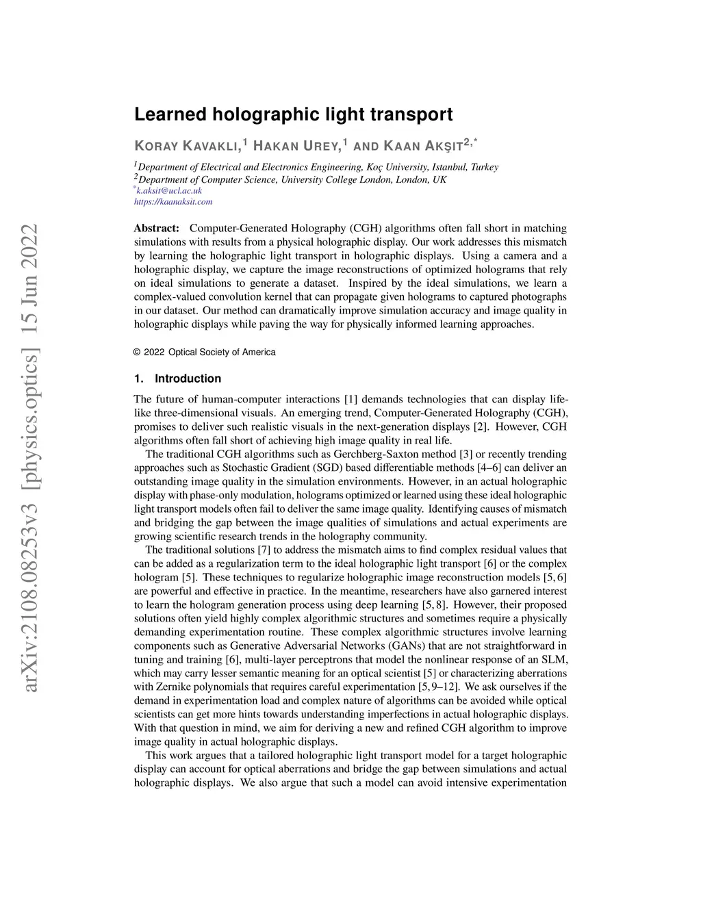 Computer-Generated Holography (CGH) algorithms often fall short in matching simulations with results from a physical holographic display. Our work addresses this mismatch by learning the holographic light transport in holographic displays. Using a camera and a holographic display, we capture the image reconstructions of optimized holograms that rely on ideal simulations to generate a dataset. Inspired by the ideal simulations, we learn a complex-valued convolution kernel that can propagate given holograms to captured photographs in our dataset. Our method can dramatically improve simulation accuracy and image quality in holographic displays while paving the way for physically informed learning approaches.